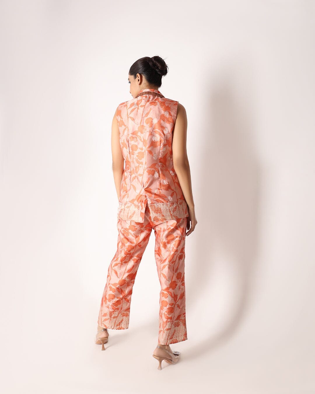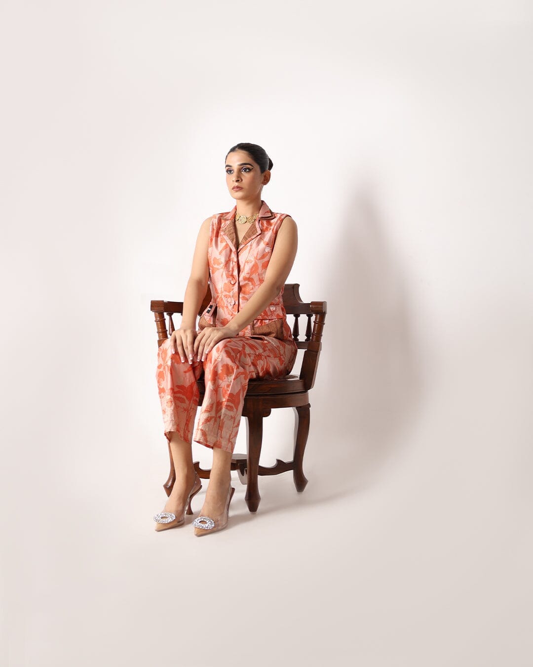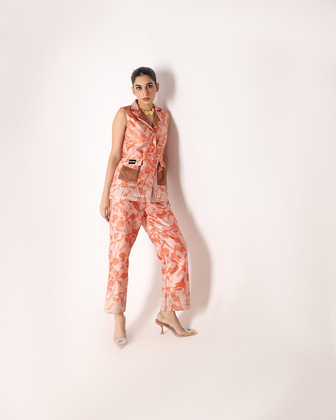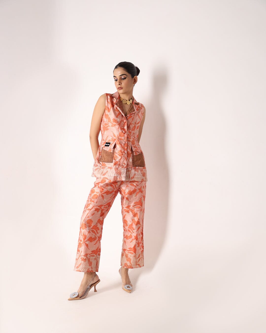 Haz la transición a la belleza del otoño con nuestro conjunto de coordinación con estampado otoñal. Confeccionado con tela de seda banarasi, este conjunto presenta un cautivador estampado otoñal y se acentúa con detalles de parches de seda marrón en bolsillos y solapas, lo que agrega un toque de elegancia a su conjunto. El pantalón viene con elástico en la espalda para mayor comodidad.
