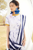 Se destaca con canalé en contraste en cuello y mangas y estampado de rayas en la caída. A diferencia de un sari, es