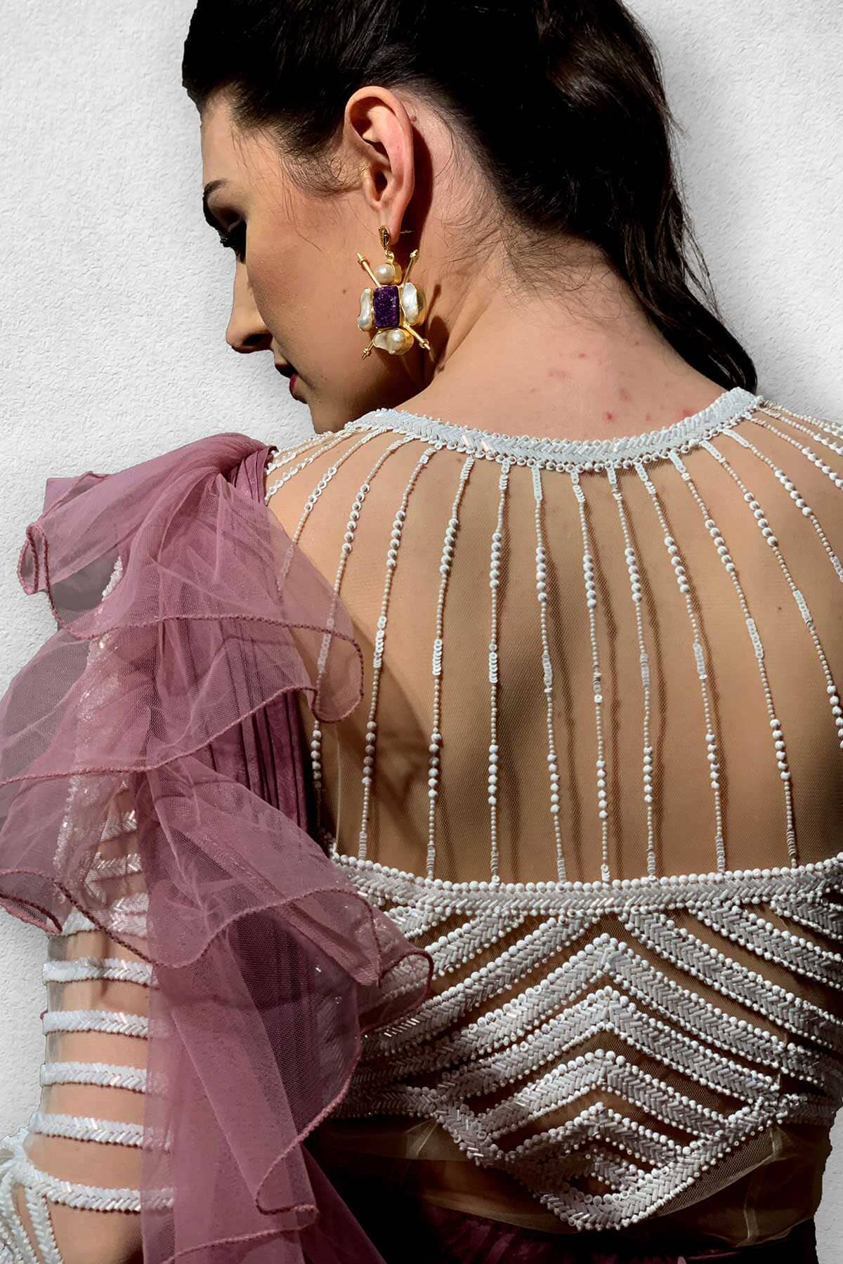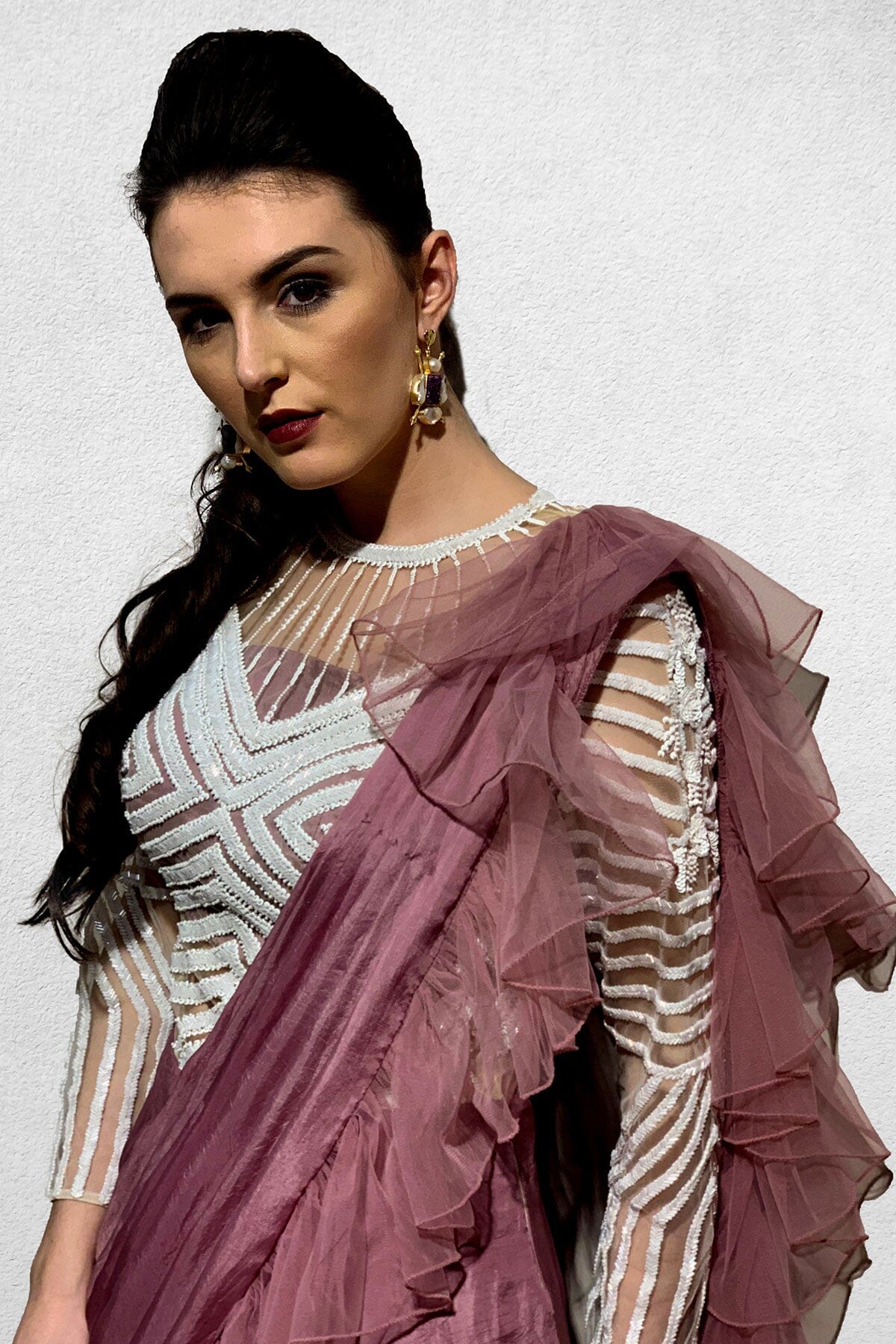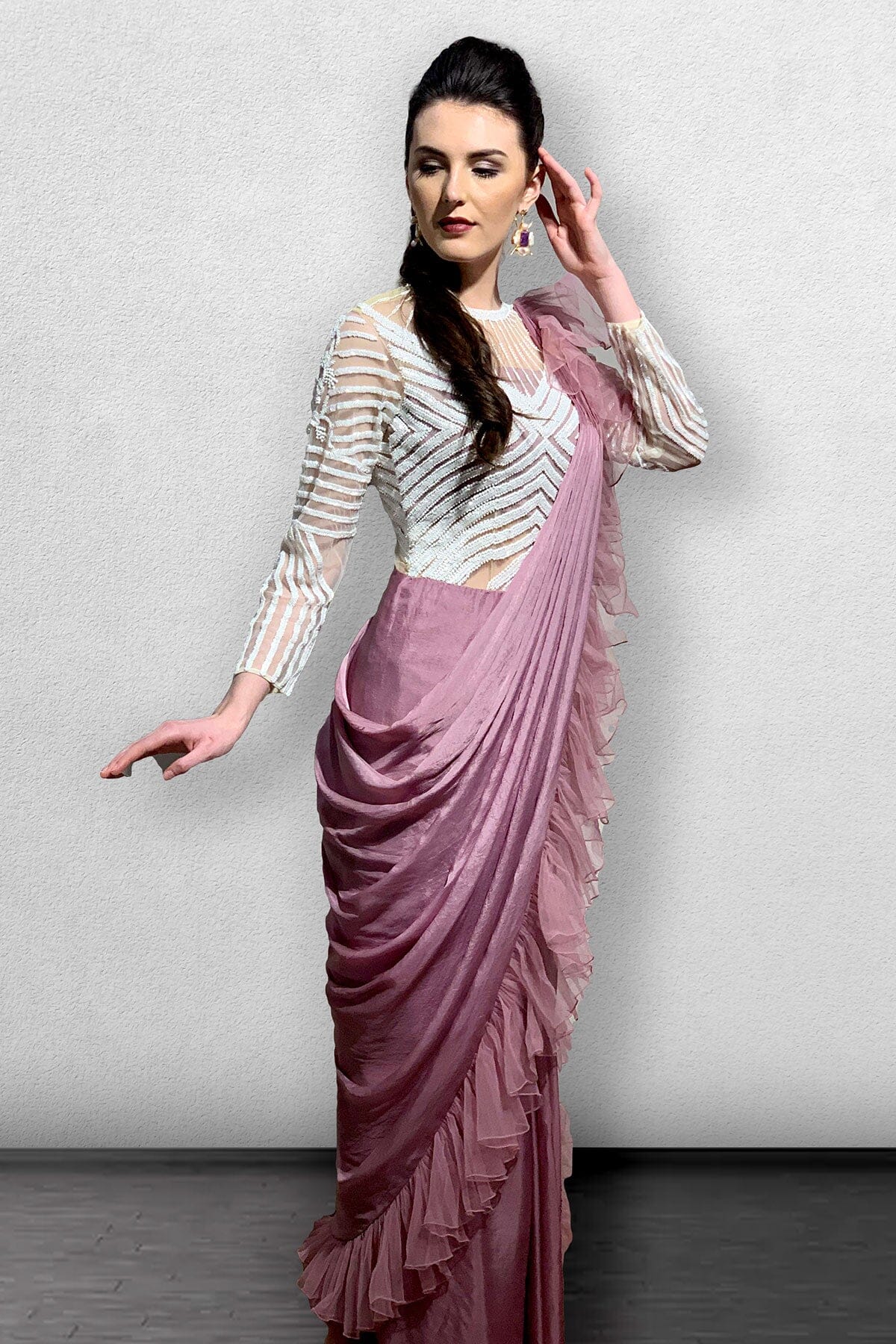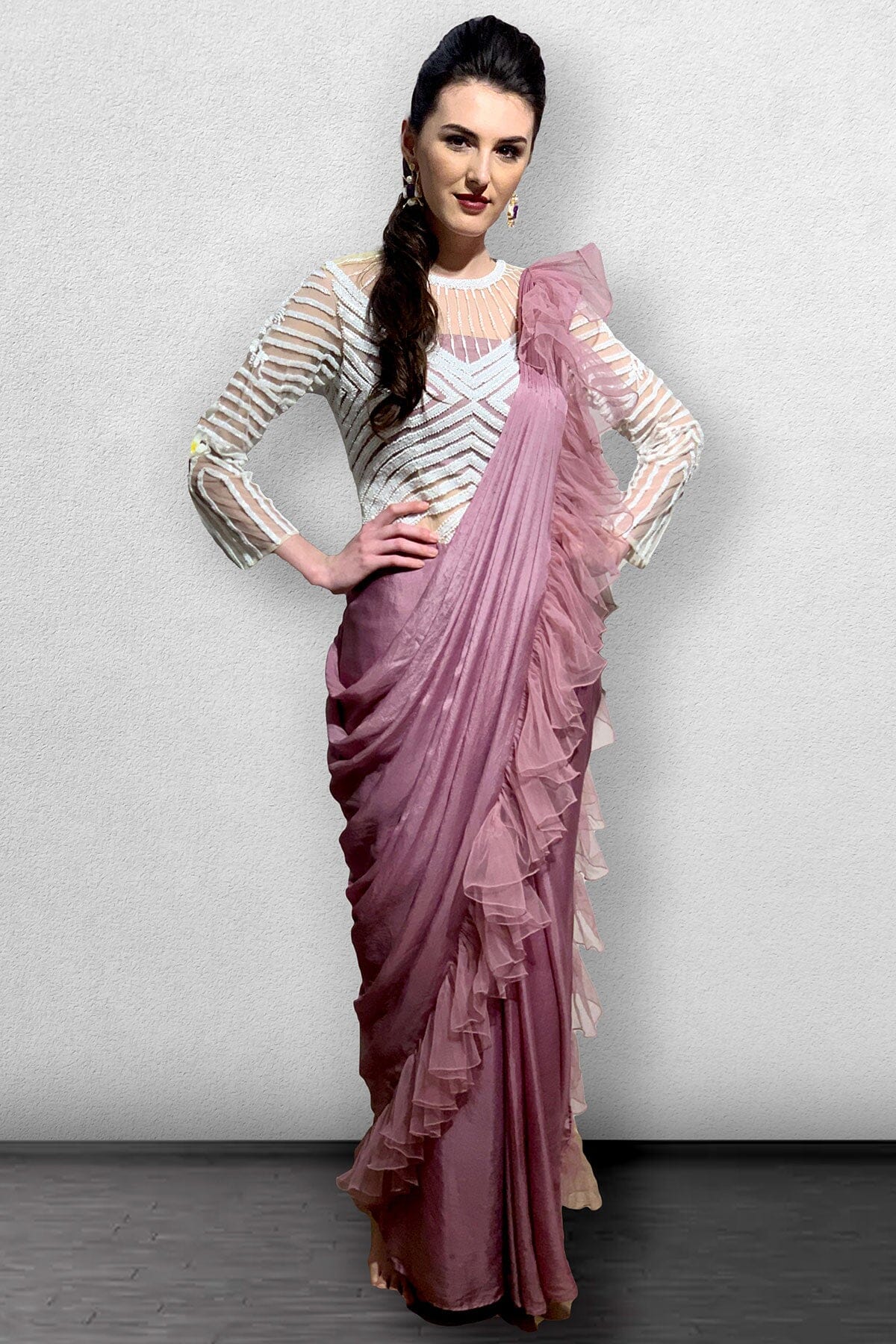 Sari drapeado de seda sintética rosa rubor con volantes de red y blusa adornada.