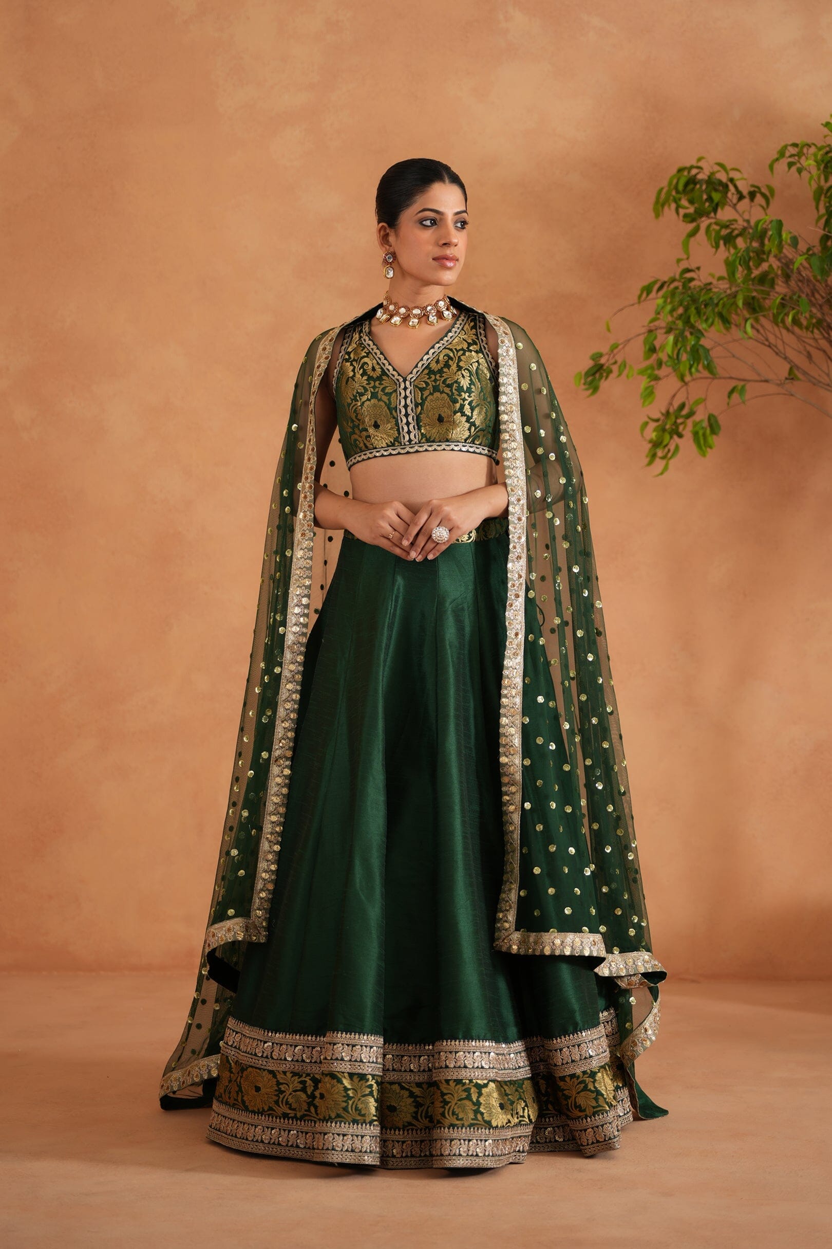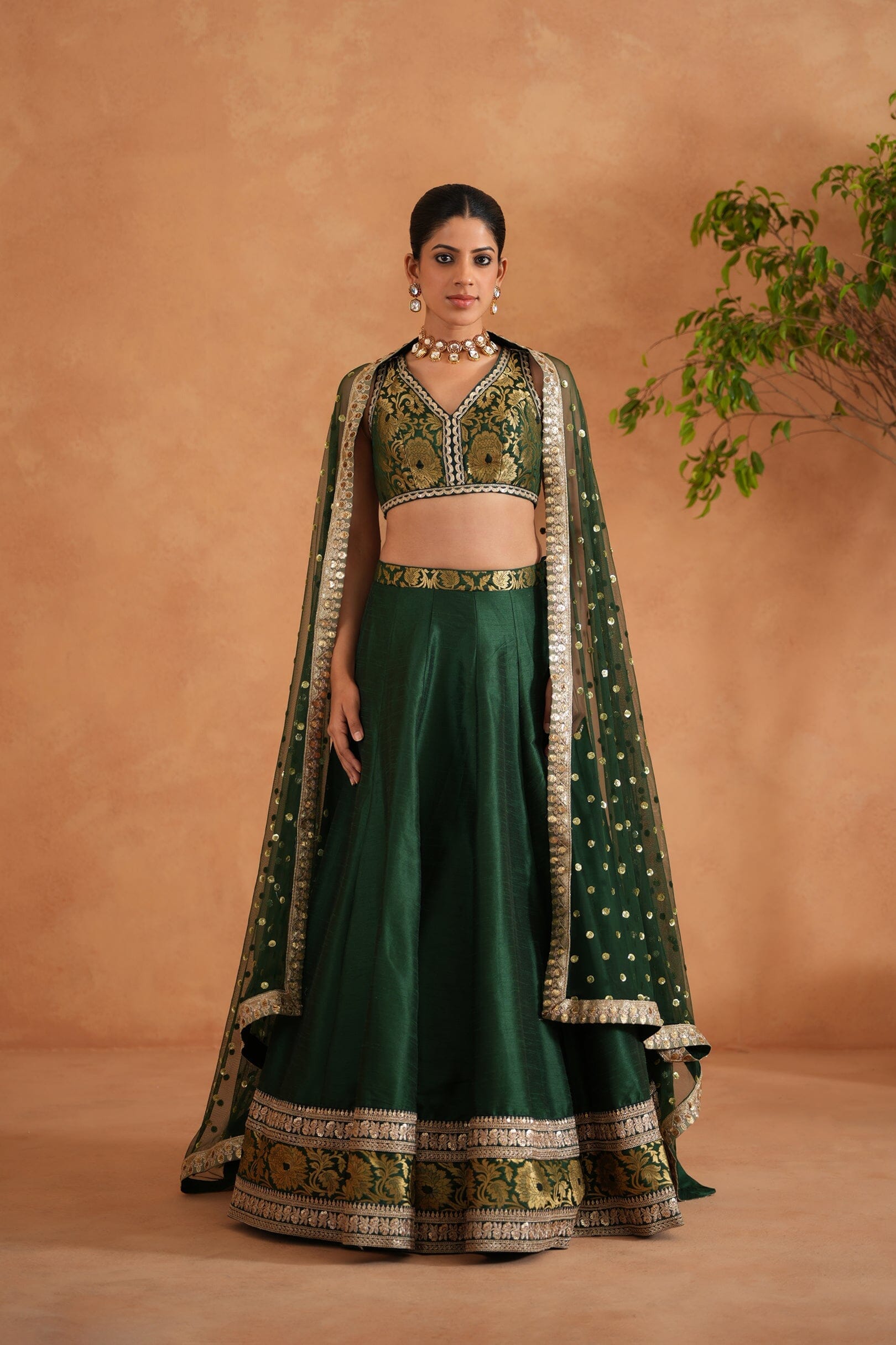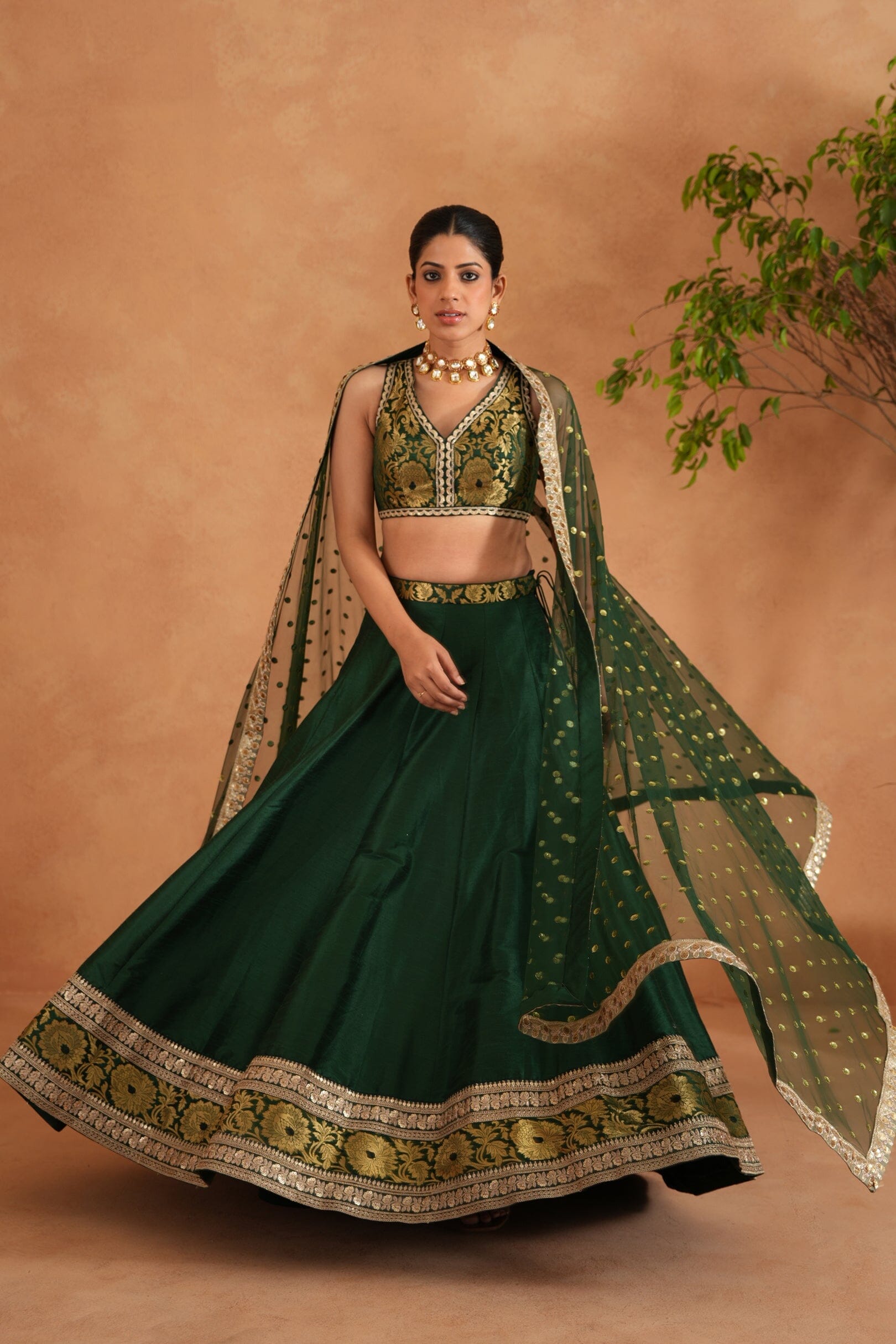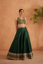 Deepika Chadha's stunning Bottle green and gold brocade fabric blouse, beautifully adorned embroidered borders. The flowy bottle green dupion silk lehenga with black and gold brocade borders adds a touch of tradition and sophistication to your look, while the soft net embroidered Dupatta with golden fringe lace keeps you light and comfortable all day long and is perfect for wedding and festive season.