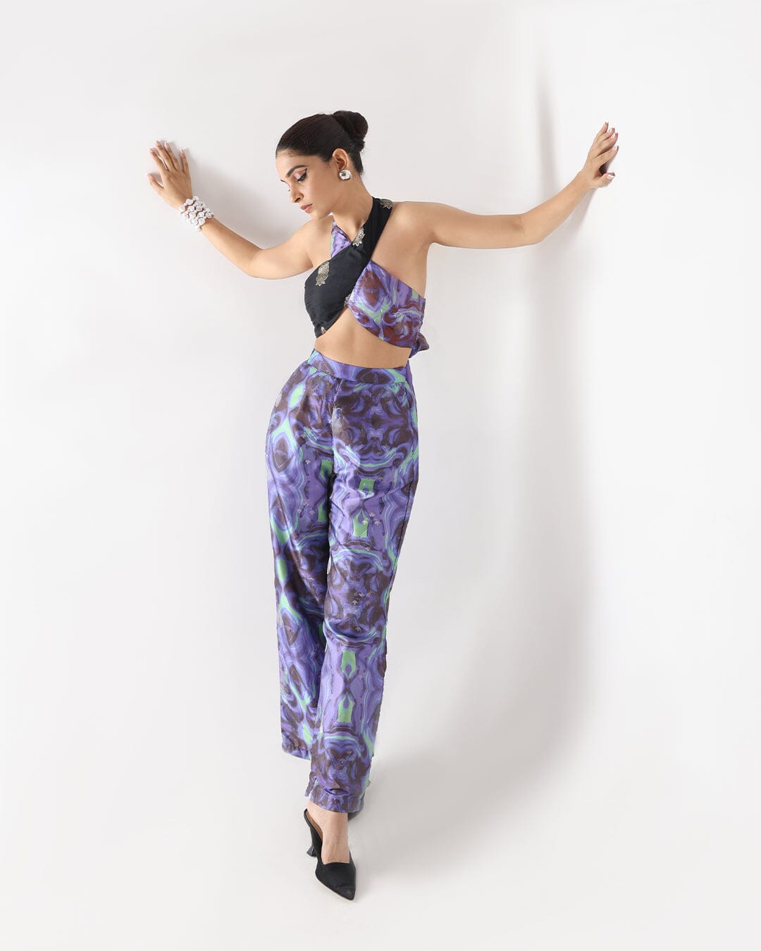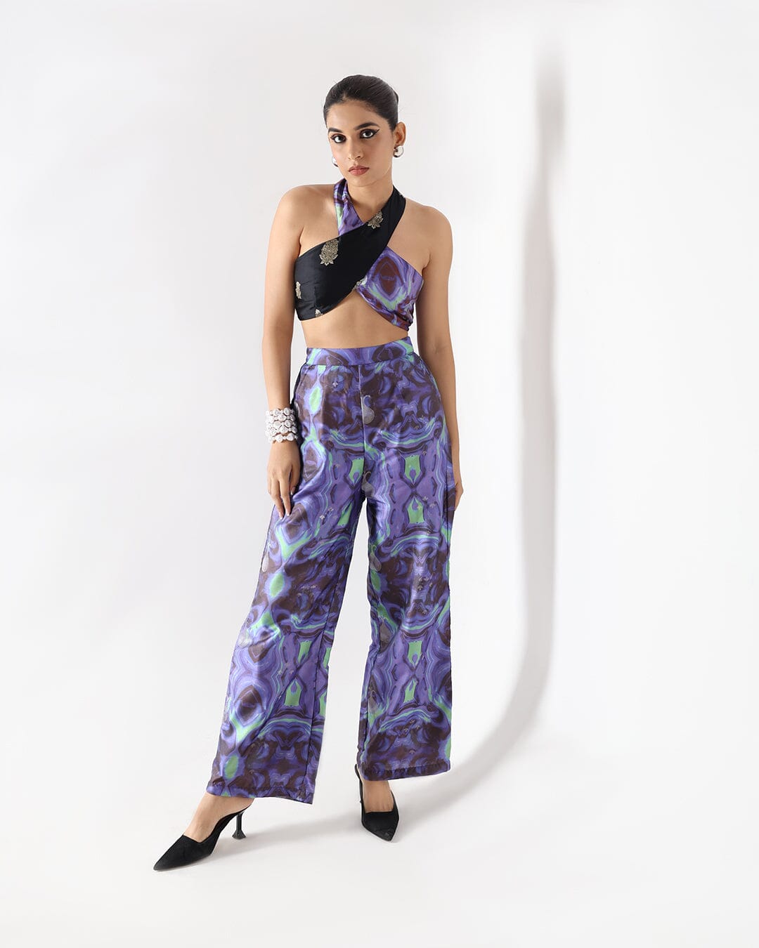 Experimente la fusión de la belleza celestial y el estilo contemporáneo con nuestro Galaxy y Black Tie-Up Top. Confeccionado con una exquisita tela de seda banarasi, este conjunto combina el encantador estampado de galaxias con un elegante diseño de lazo negro, creando una apariencia fascinante y moderna.