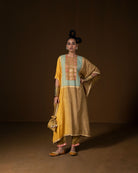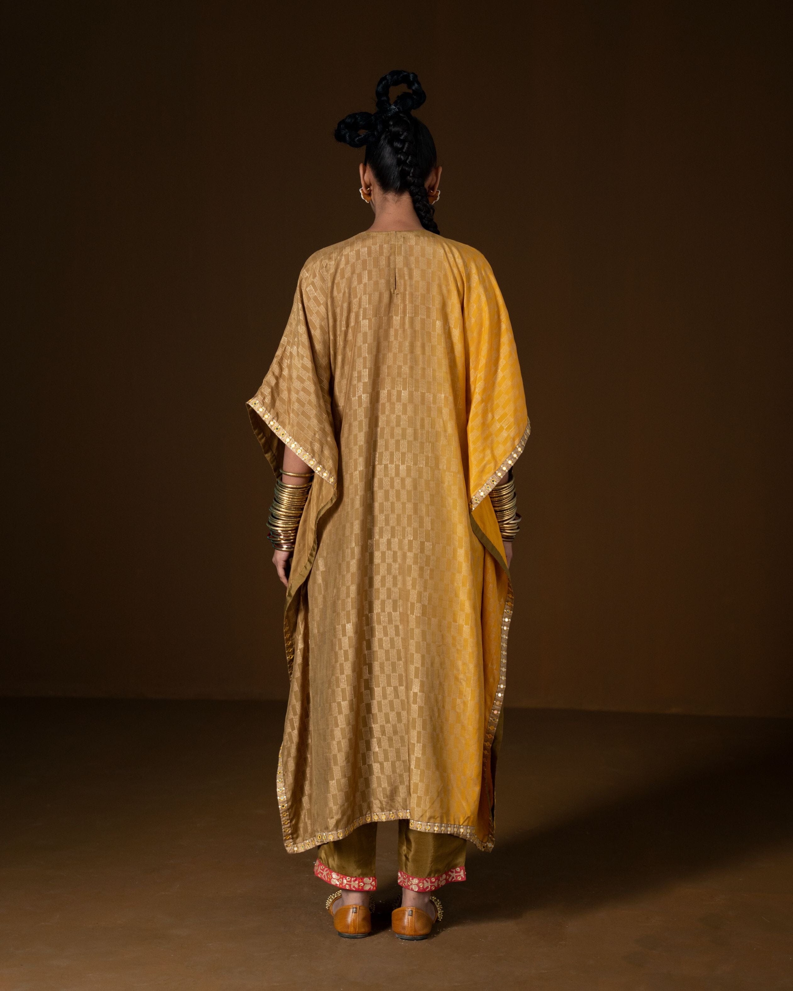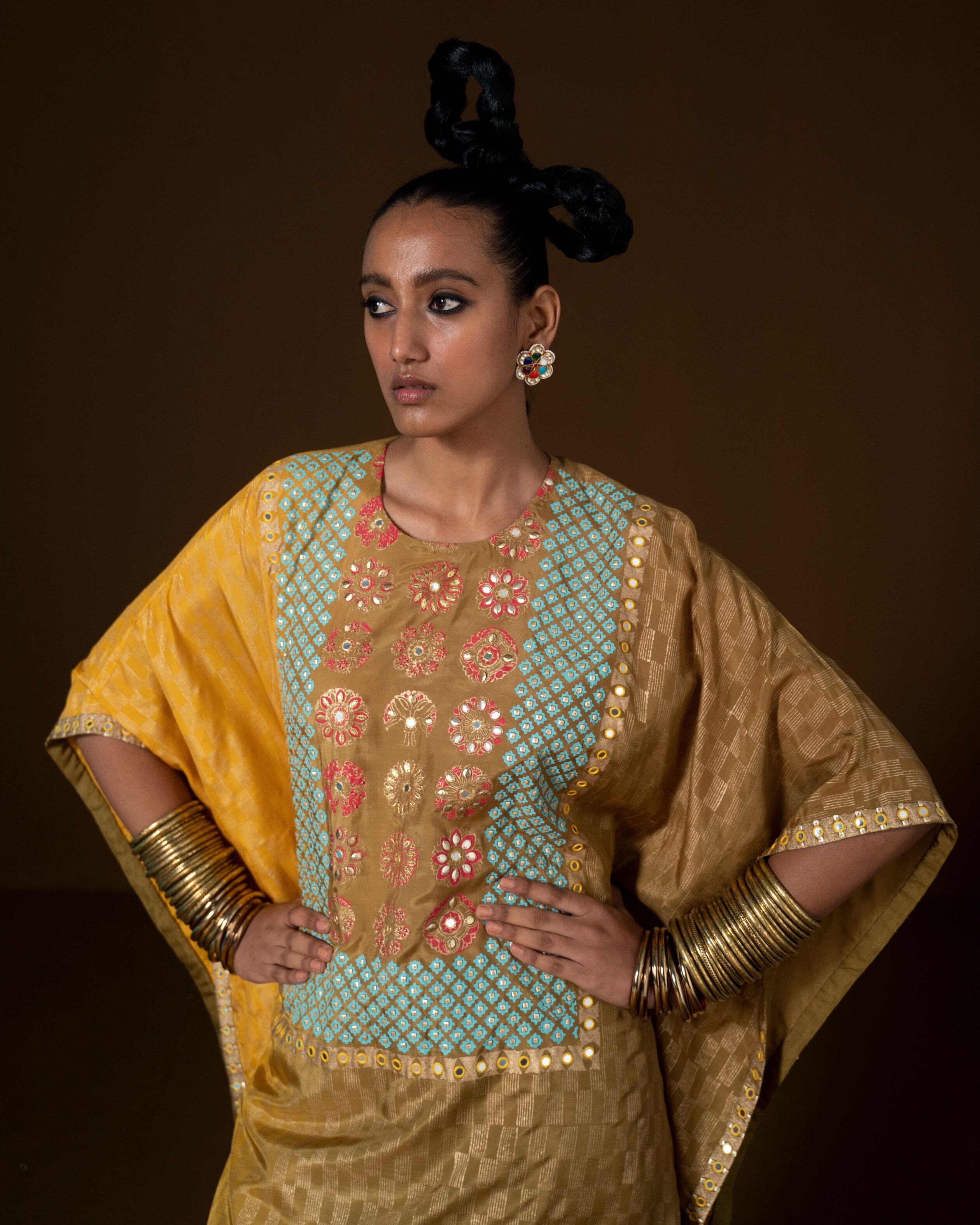 CHAKRAPHOOL KAFTAAN está hábilmente confeccionado con rica seda veraniega y adornado con lentejuelas 3D, bordados de espejo y bordes bordados en oro a lo largo de los lados. Los pantalones pitillo que lo acompañan cuentan con un dobladillo bordado y un encantador tono ombre mostaza oliva.