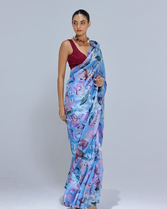 ESTAMPADO DE COLOCACIÓN FLORAL ABSTRACTO, VESTIDO ASIMÉTRICO MICRO PLISADO A MANO CON ESPEJO BORDADO A MANO Y DETALLES DE TRABAJO DE HILO