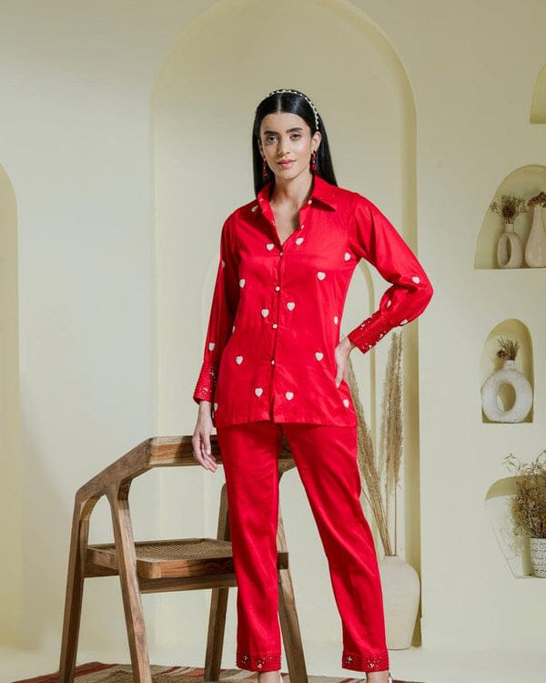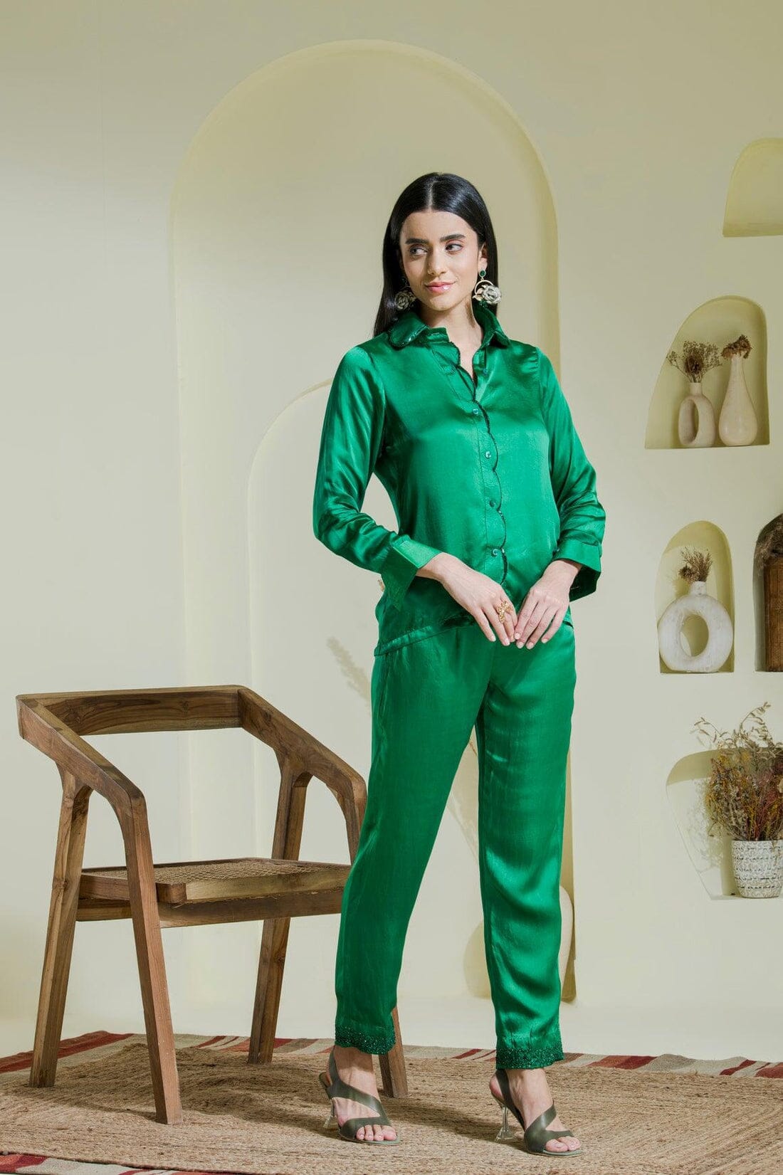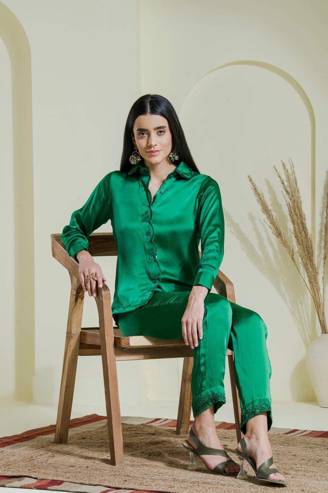 If you are a fan of jewel tones then this shirt set is the right pick for you.Step into casual sophistication with our emerald green shirt with scallop cutwork detailing on collar and shirt front it is paired with straight pants with scattered sequins work. Don't forget to check out the sexy back !