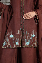 Lehnga de tul lila con volantes y blusa floral tonal adornada en 3D, completa con duppatta estilo gargantilla y colgantes.