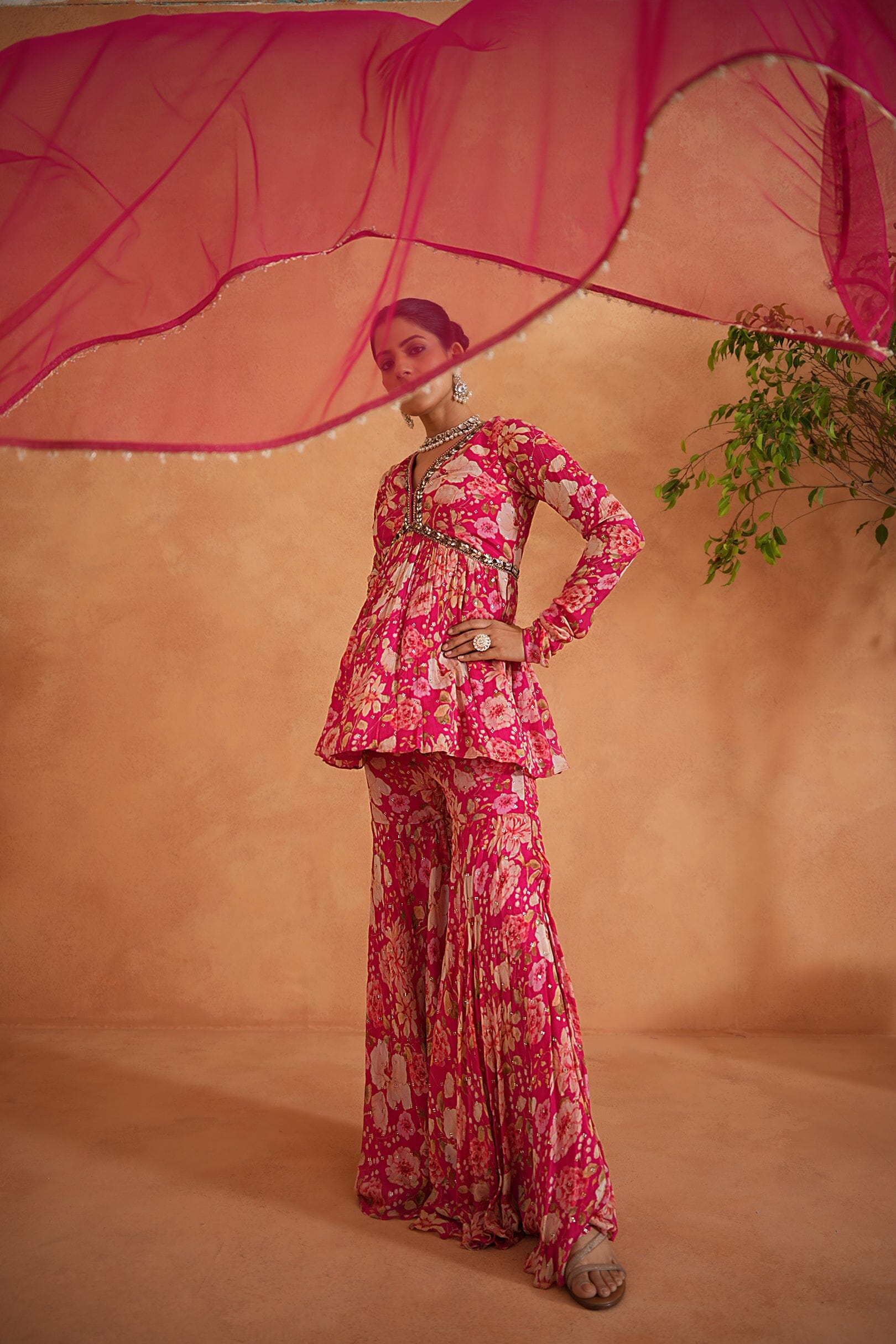 Deepika Chadha's stunning Fuchsia chiffon printed fabric peplum kurti beautifully adorned with sequins, cutdana crystals embroidery. The flowy fuchsia chiffon printed fabric garara adds a touch of sophistication to your look. it is paired with soft net dupatta which keeps you comfortable all day long and is perfect for wedding and festive season.