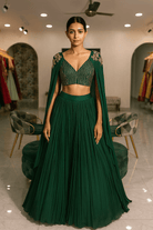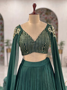 Elevate your festive and formal occasions with this exquisite Bottle Green Drape Sleeve Lehenga. Crafted from luxurious crepe fabric, the lehenga offers a graceful drape and comfortable fit. The intricately embroidered blouse adds a refined touch, showcasing expert craftsmanship and attention to detail. Its elegant drape sleeves enhance the silhouette, blending traditional charm with contemporary style. Perfect for weddings, celebrations, or special events, this lehenga combines sophisticated design with timeless appeal for a striking presence.