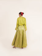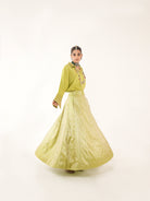 Lehenga de seda verde Gurleen, intrincadamente tejida con tejido jaal, combinada con una camisa a juego de talla libre con cuello y puños de seda para darle sofisticación.