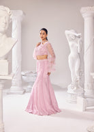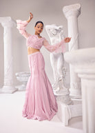 From the soothing colours that speak to your soul, this ensemble is a perfect set for this blooming summer season. Our intricately embroidered bodice with pearl and lace detailing further highlighted with net ruffle bell sleeves, paired with a breezy summer fabric, Crepe, in a fishcut Lahenga with pearl and lace detailing is a perfect illustration of comfort and finess for you.