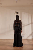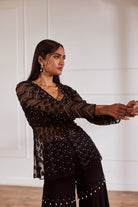 Peplum de red negro completamente bordado con corpiño de seda combinado con garara negra, con borlas en las uniones.
