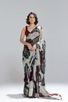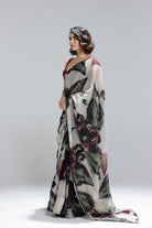 A timeless drape reimagined — this organza saree in our signature ivy gardenia print is adorned with delicate sequin handwork that enhances its classic appeal. The pleated waist flows seamlessly into floral elegance, while the contrasting wine blouse adds a striking touch. A perfect pick for evening occasions where tradition meets modern sophistication.
