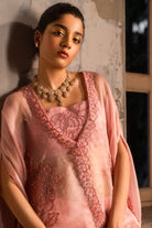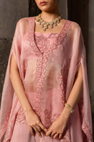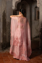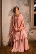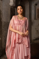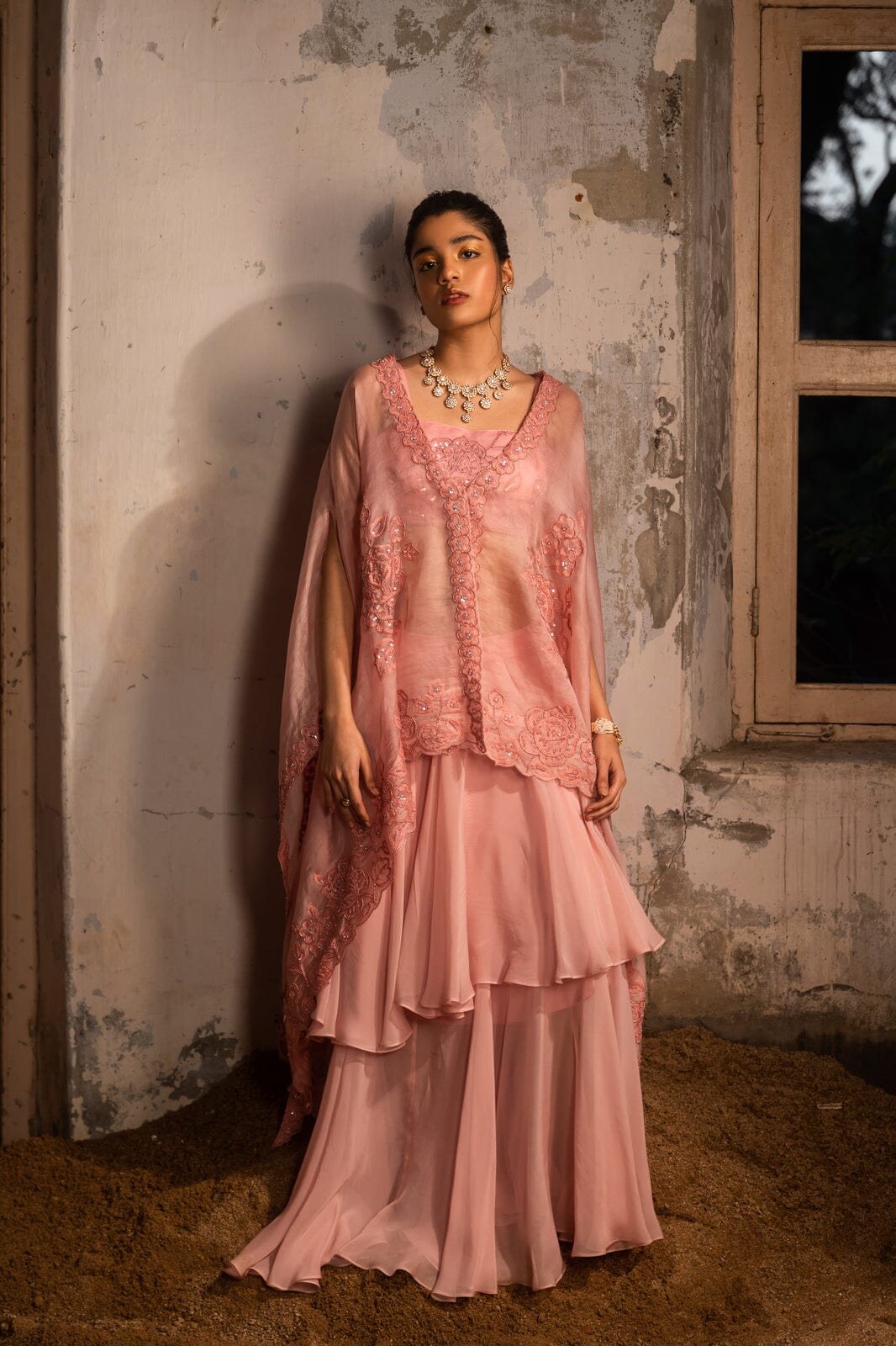 A baby pink jacket set with thread work and hand-embroidery, paired with a bustier and layered skirt. A baby pink jacket set paired with bustier and skirt.