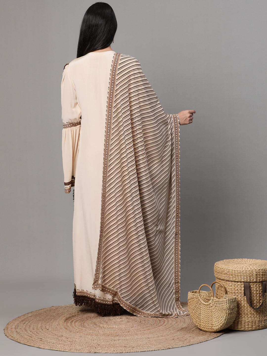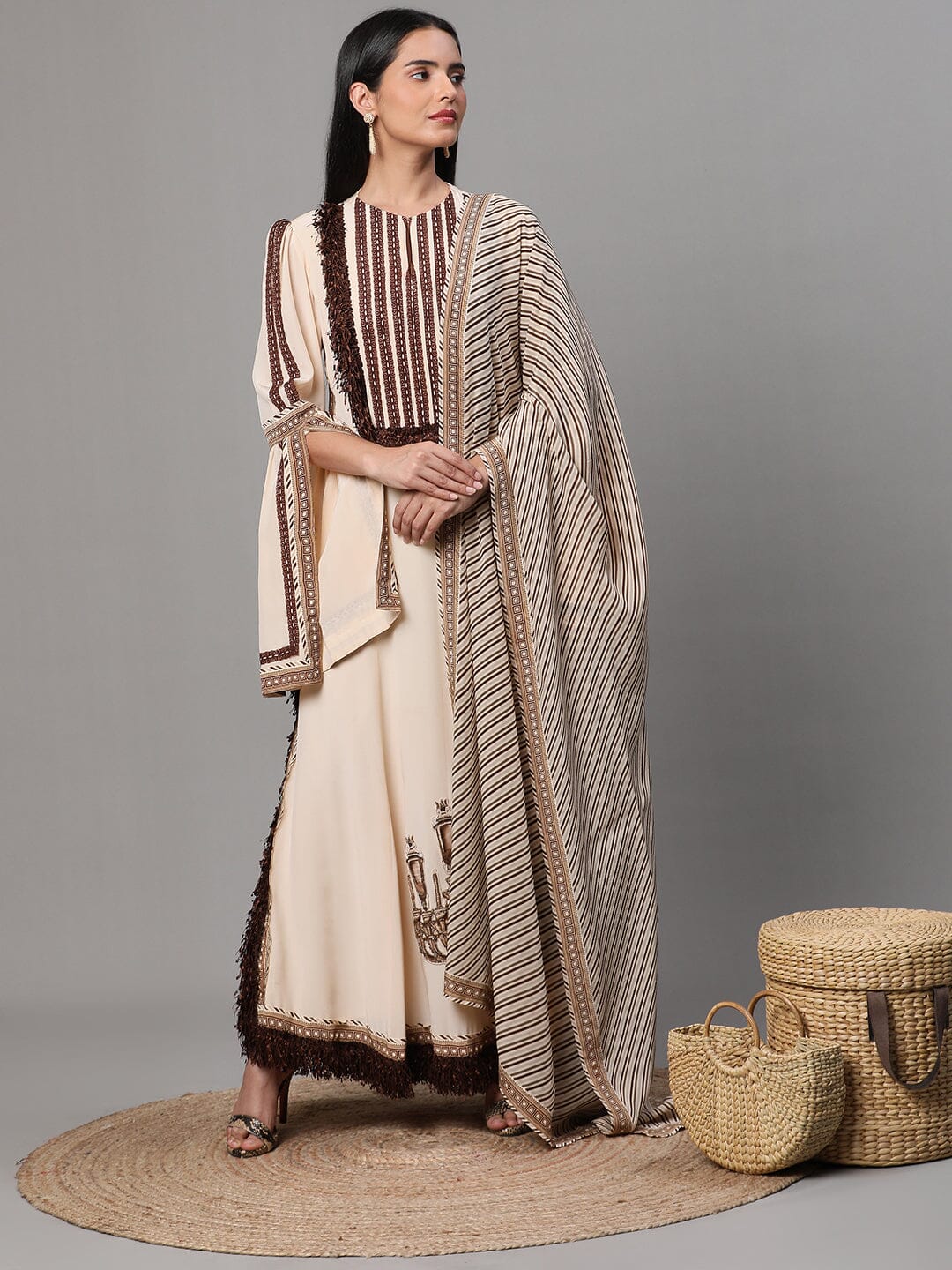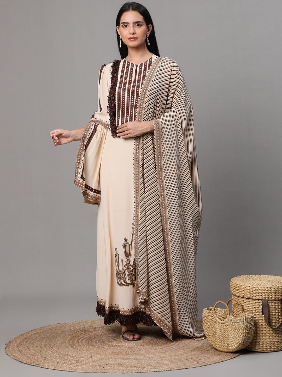 Traje bordado beige con dupatta y pantalón