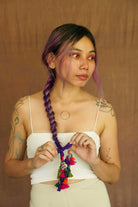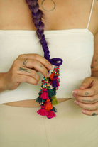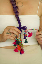 Un montón de lindas borlas multicolores unidas en un parandi con cuentas de vidrio son un accesorio perfecto para ese look elegante.