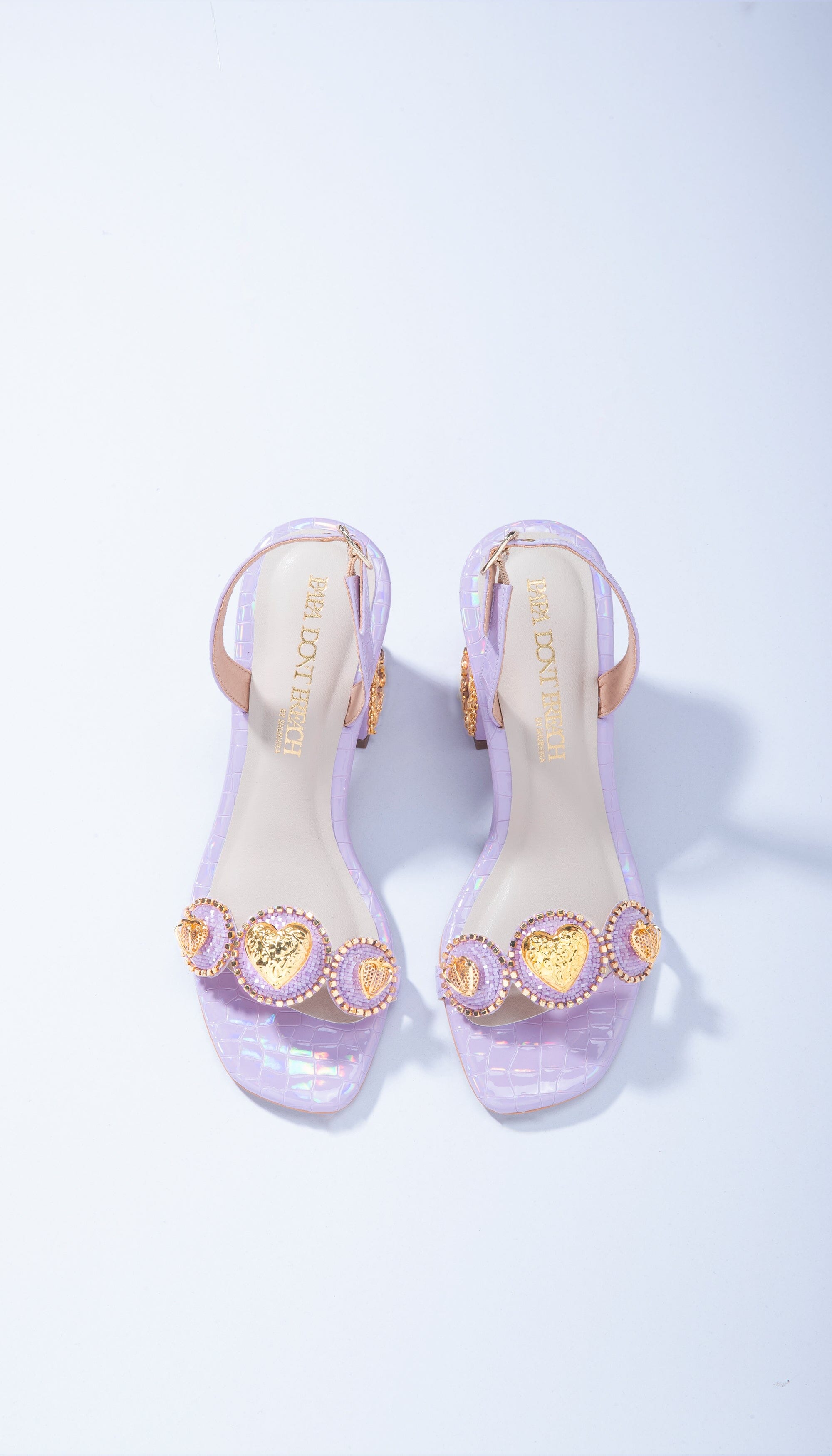 Delicious like a French macaroon, these dainty block heels, constructed in a holographic vegan leather, feature a strap made of circular treats, hand embellished with glass-cut beads and 3D gold metal hearts.