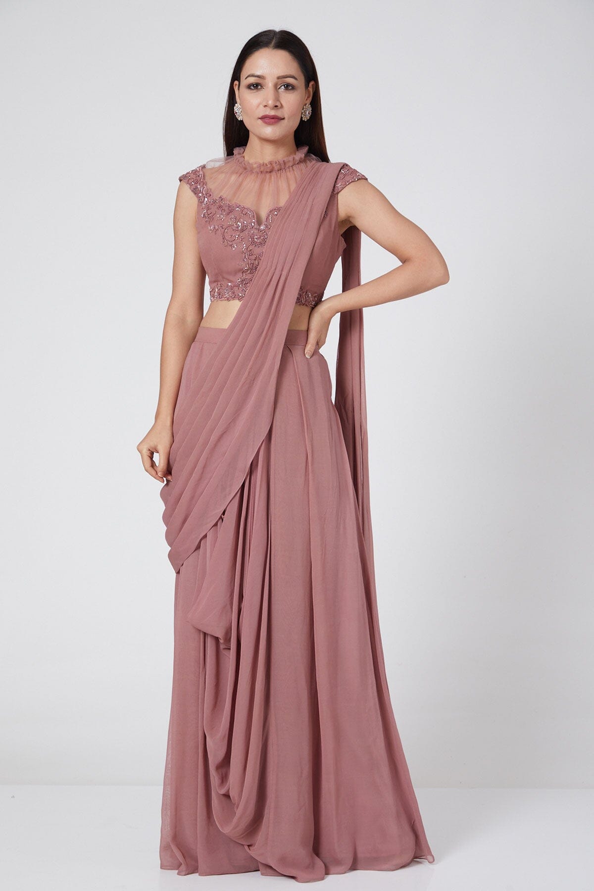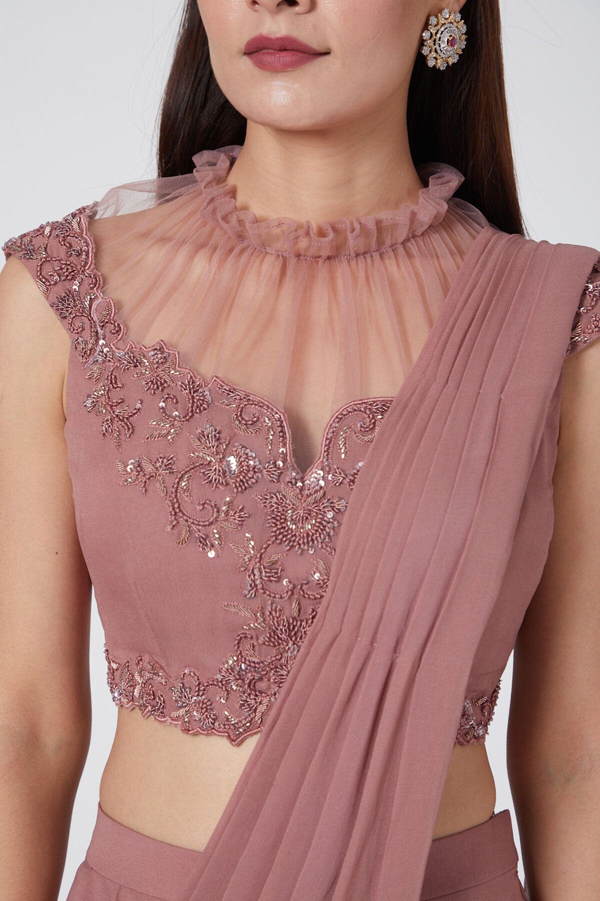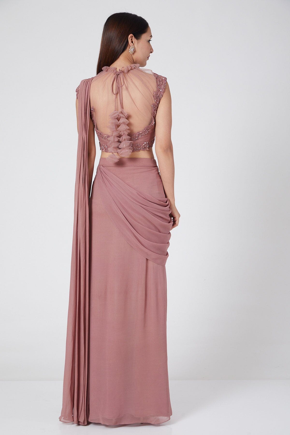 Los collares con volantes y las borlas se suman a la exuberancia del sari drapeado de color vino claro. Confeccionado con espléndida seda y fina tela Georgette.