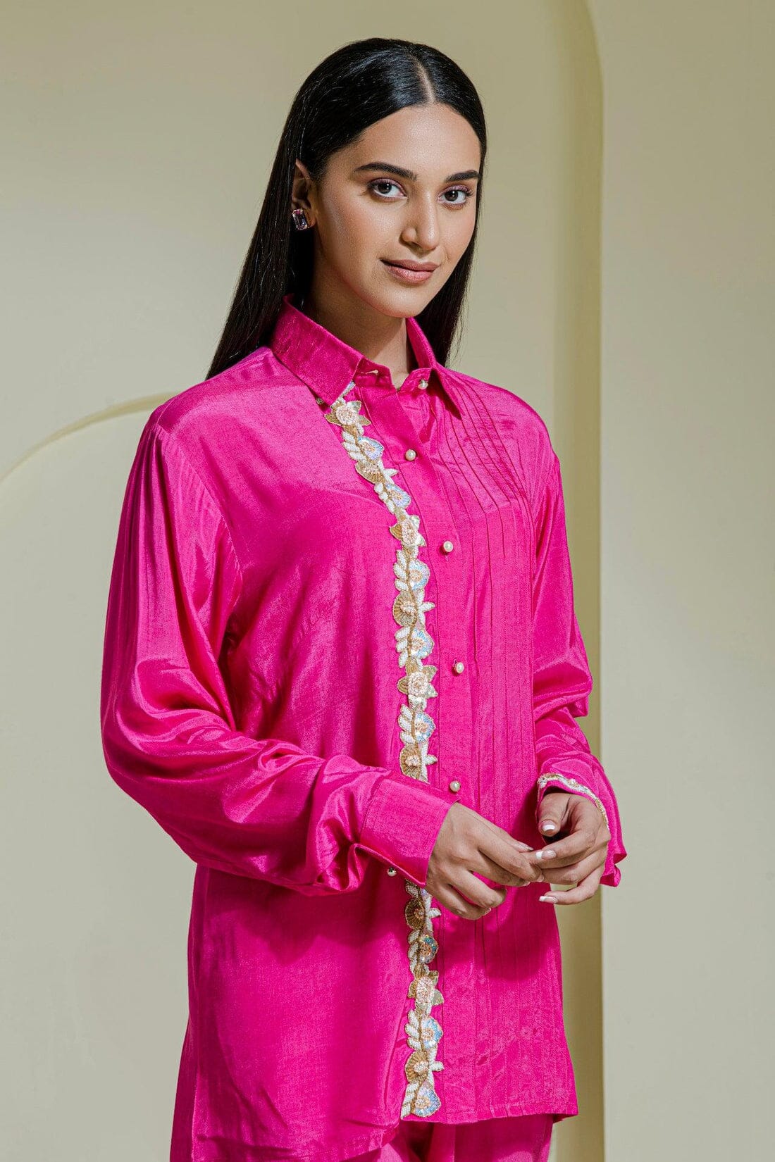 A perfect fit for your brunch date with the girlies ! delicate hand embroidered floral pattern with pintucks and pearl buttons on shirt paired with straight plain pants.