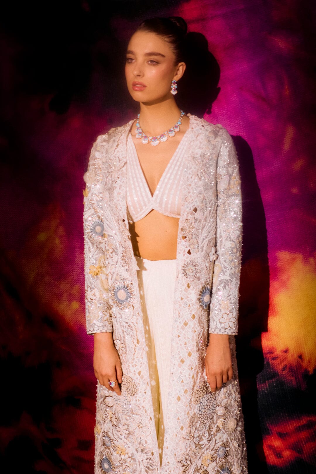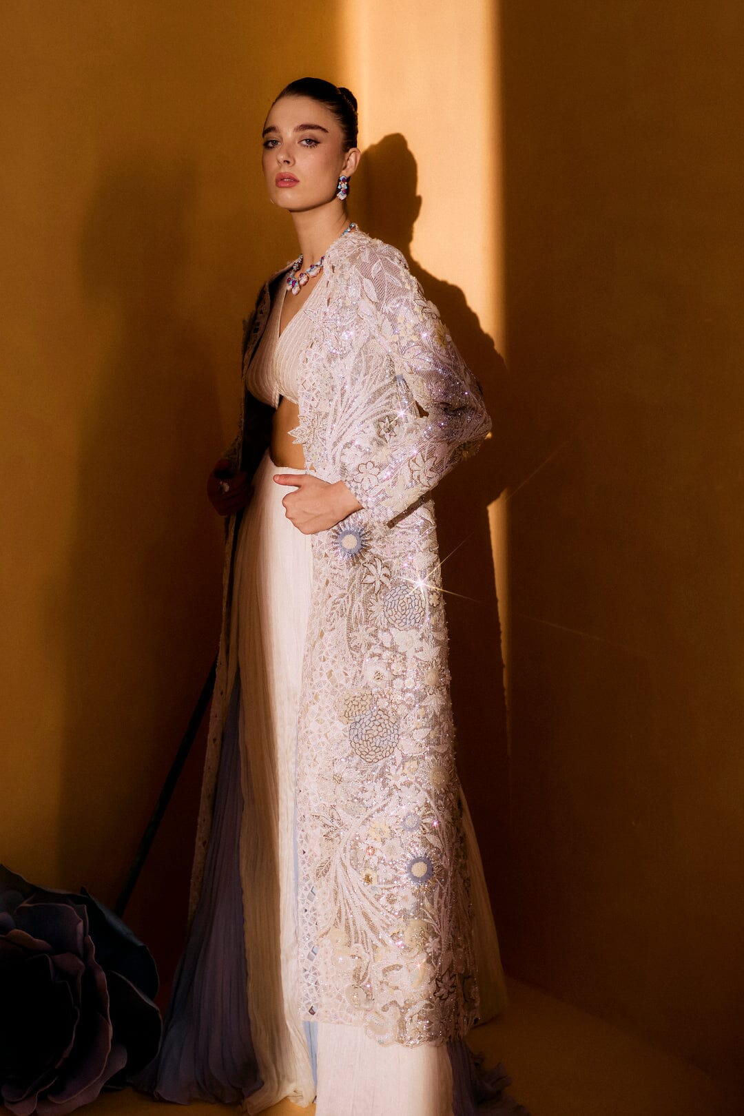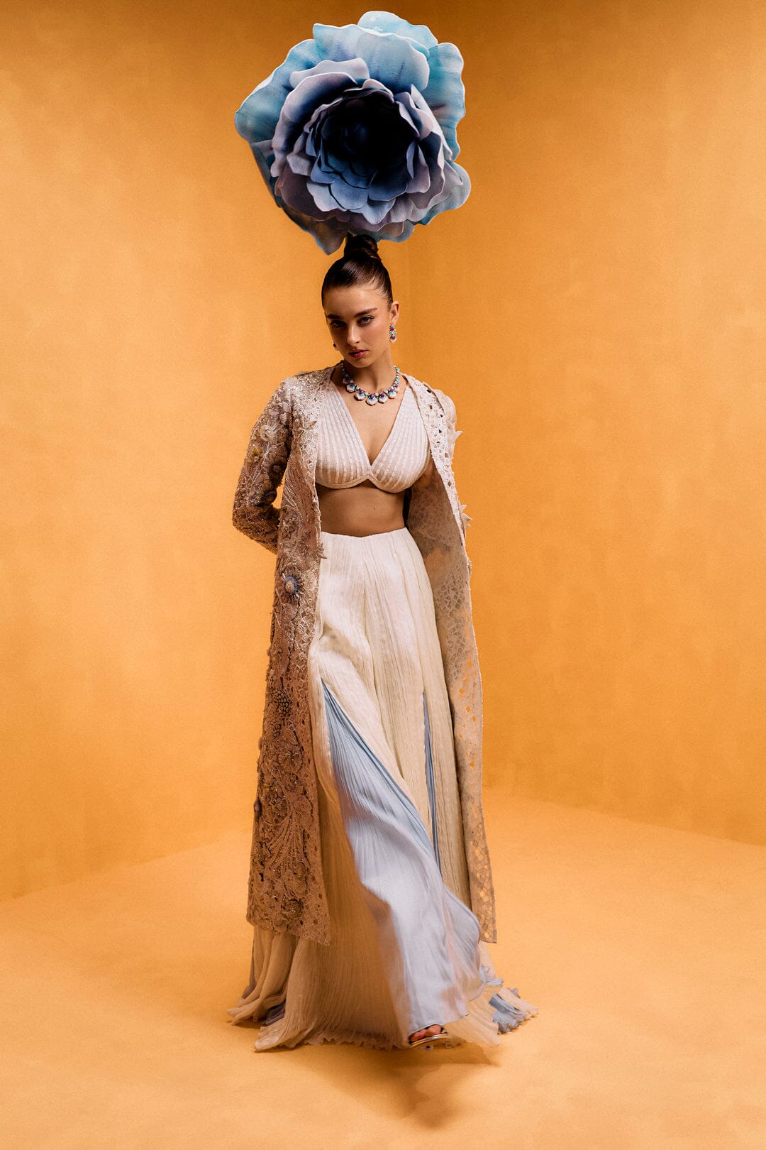 Magnolia invites you to step into a dreamscape inspired by the magic of a starry night. This three-piece set, featuring a sequin-filled jacket, an intricately embroidered bustier, and your choice of flowing palazzo pants or a softly scrunched skirt, creates a captivating silhouette. The sequin-filled jacket is like the night sky itself, catching the light from every angle. As the light falls on the jacket, it sparkles and shimmers, reminiscent of stars twinkling across a dark sky. The latticed, pleated, and appliquéd details enhance the depth and texture of the design, creating an effect of light and shadow that seems to move with you. Each sequin adds a touch of magic, evoking the serene beauty of a starry evening. Beneath it, the embroidered bustier fits like a second skin, its delicate embroidery adding a soft glow that contrasts with the jacket’s shimmering stars. The tailored fit enhances your silhouette, offering both comfort and elegance. The palazzo pants or scrunched skirt provide the perfect balance to this celestial look. The palazzo pants flow dramatically with each step, while the scrunched skirt creates a soft, textured layer that adds fluidity to the ensemble. Together, Magnolia brings the enchantment of a starry night to life, with every detail—from the latticed pleats to the appliqué work—capturing the beauty of light and movement.