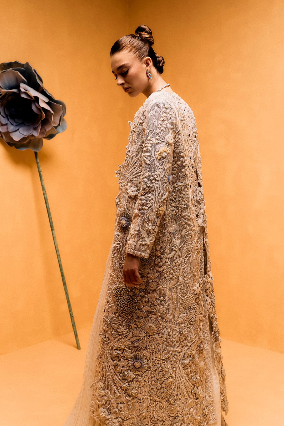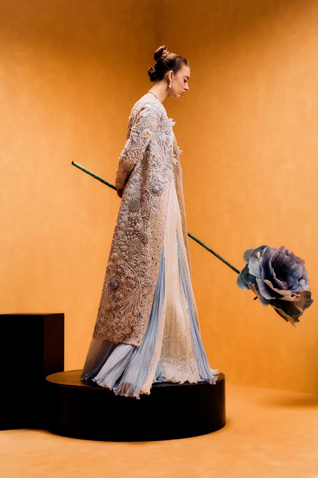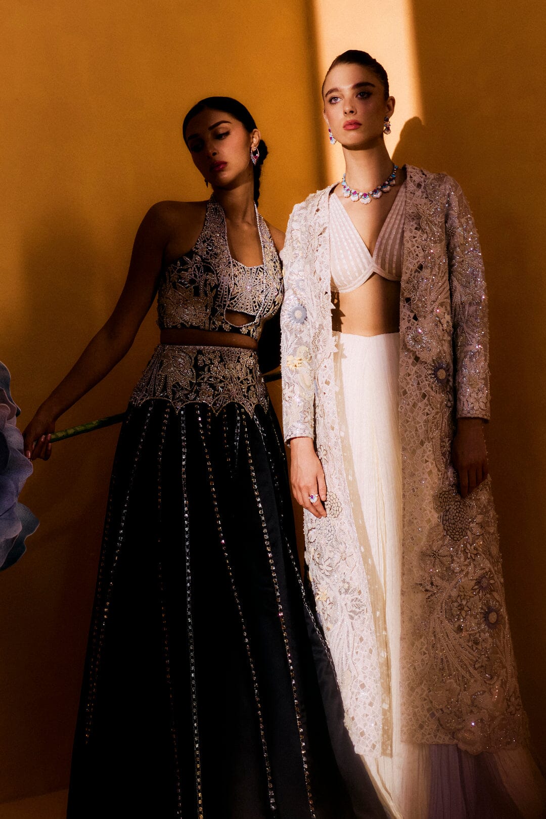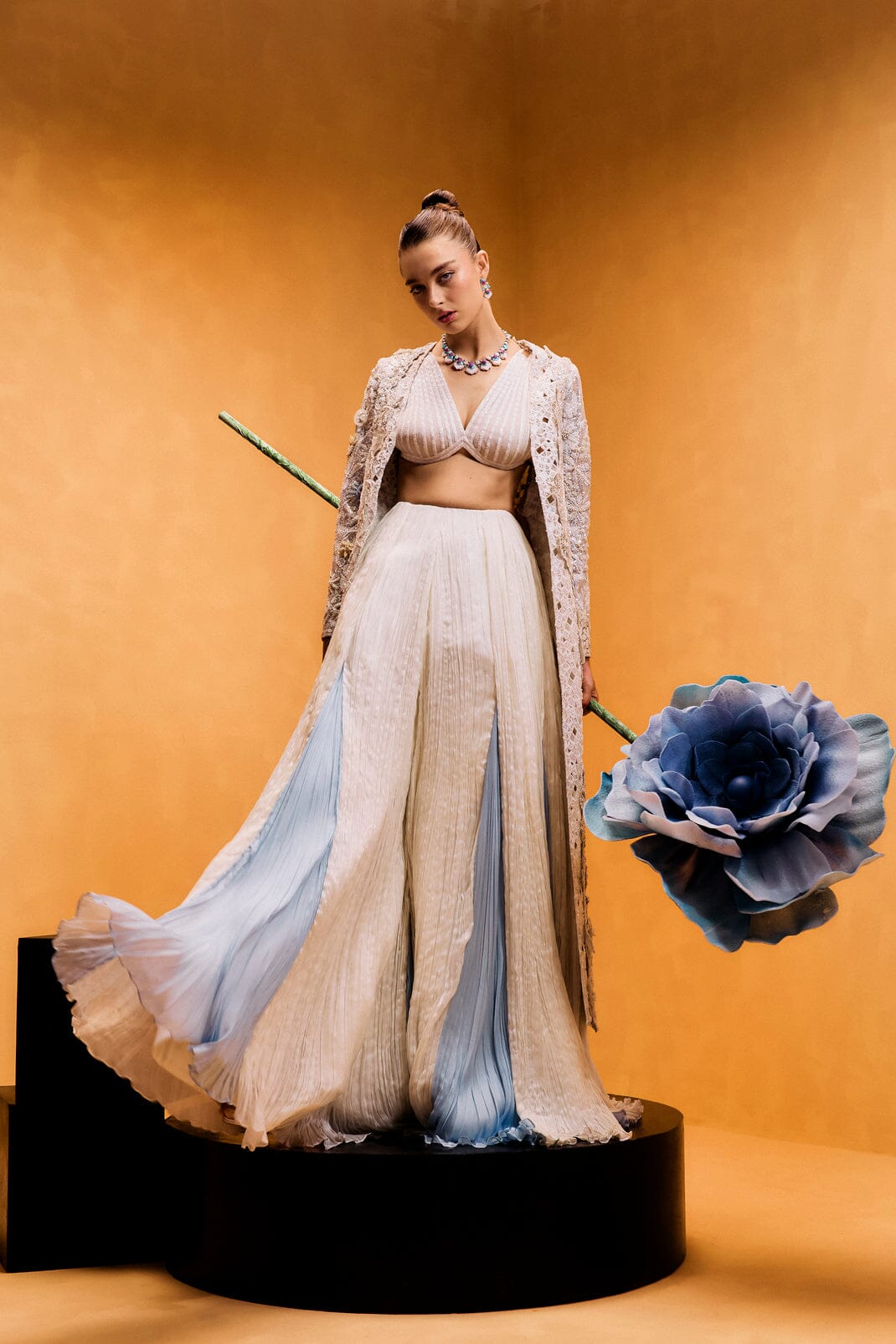 Magnolia invites you to step into a dreamscape inspired by the magic of a starry night. This three-piece set, featuring a sequin-filled jacket, an intricately embroidered bustier, and your choice of flowing palazzo pants or a softly scrunched skirt, creates a captivating silhouette. The sequin-filled jacket is like the night sky itself, catching the light from every angle. As the light falls on the jacket, it sparkles and shimmers, reminiscent of stars twinkling across a dark sky. The latticed, pleated, and appliquéd details enhance the depth and texture of the design, creating an effect of light and shadow that seems to move with you. Each sequin adds a touch of magic, evoking the serene beauty of a starry evening. Beneath it, the embroidered bustier fits like a second skin, its delicate embroidery adding a soft glow that contrasts with the jacket’s shimmering stars. The tailored fit enhances your silhouette, offering both comfort and elegance. The palazzo pants or scrunched skirt provide the perfect balance to this celestial look. The palazzo pants flow dramatically with each step, while the scrunched skirt creates a soft, textured layer that adds fluidity to the ensemble. Together, Magnolia brings the enchantment of a starry night to life, with every detail—from the latticed pleats to the appliqué work—capturing the beauty of light and movement.