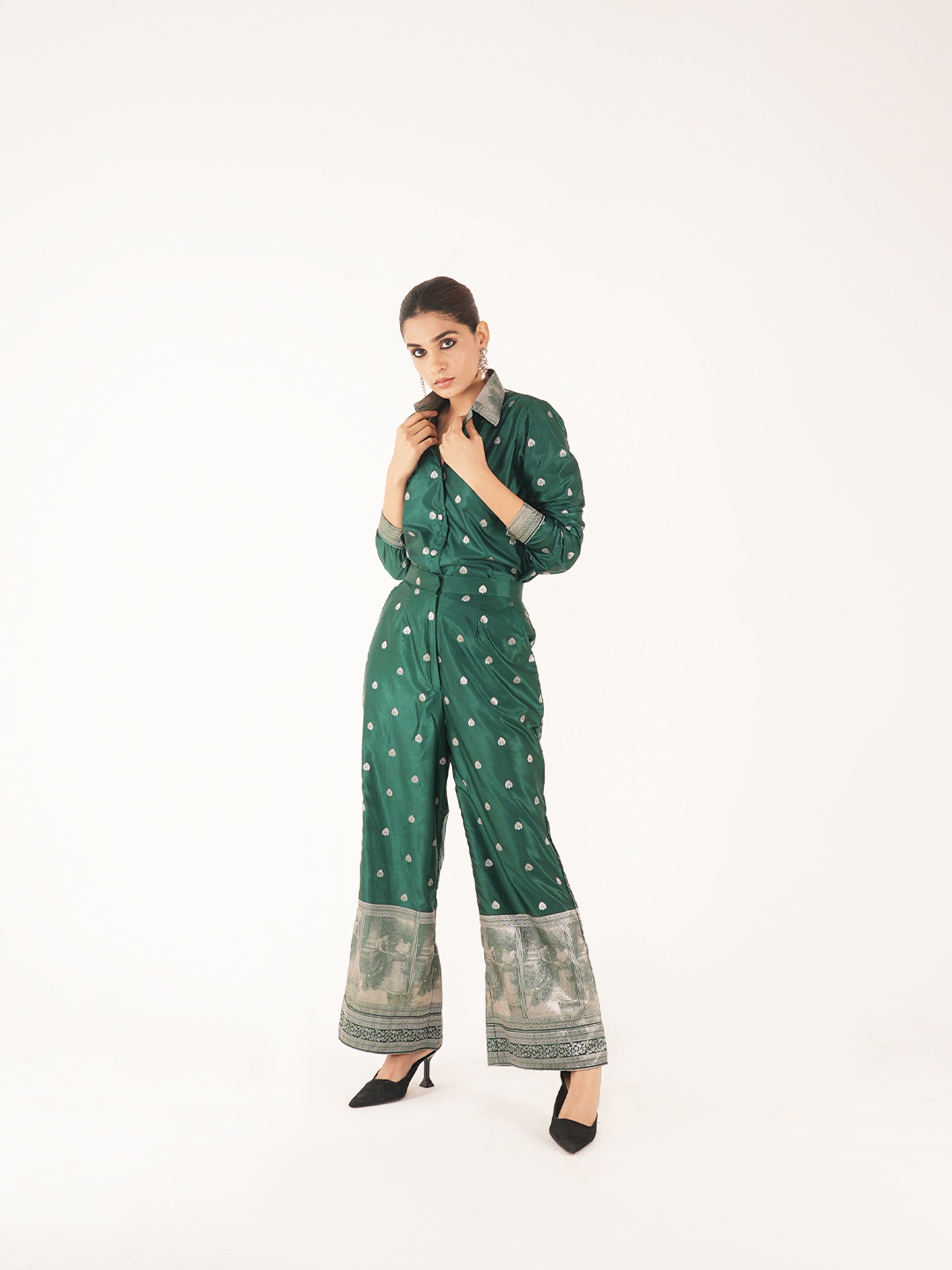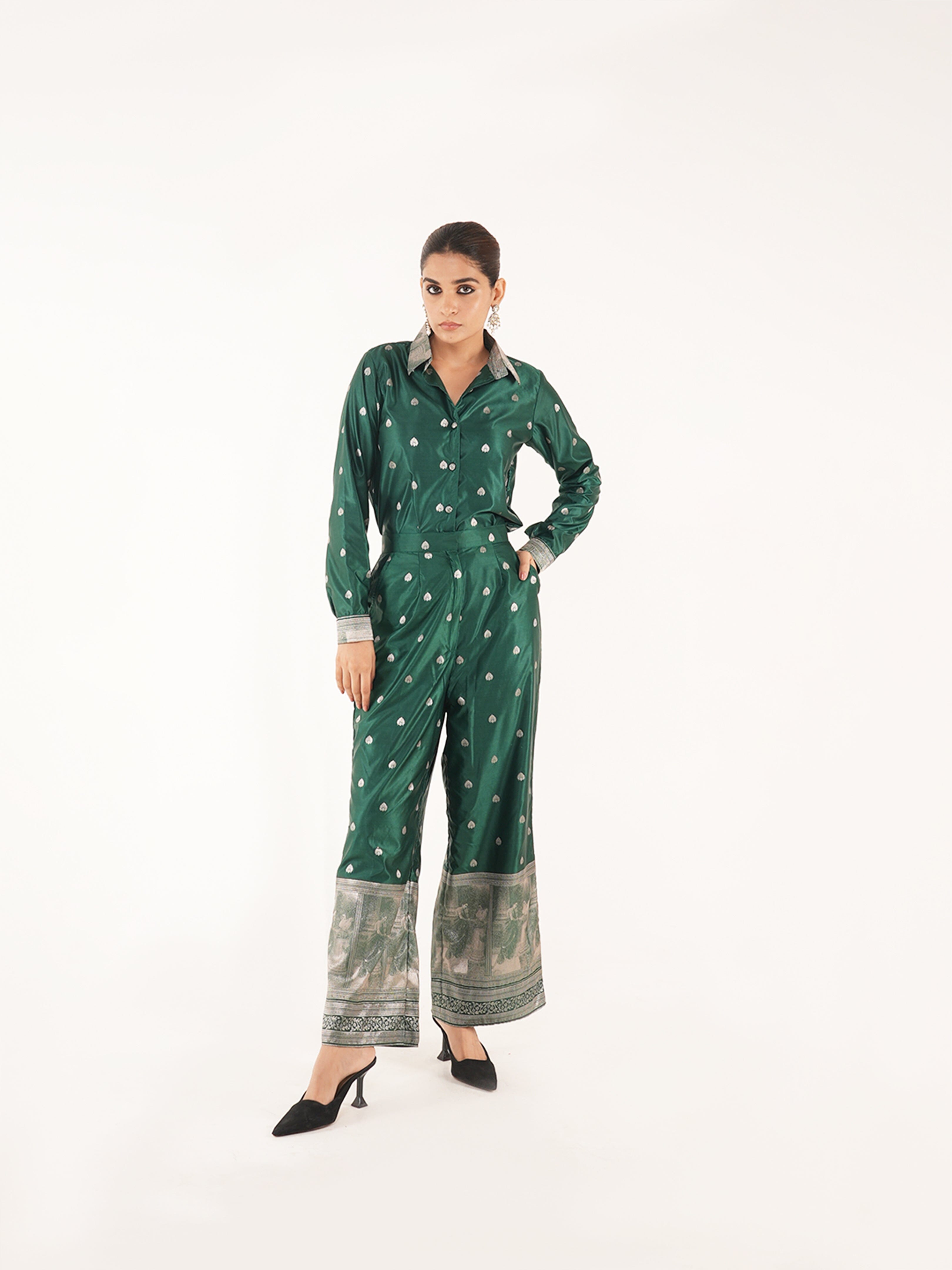 Conjunto de conjunto de seda Meera en verde. Presenta una camisa corta de seda con cuello safari mejorado y puños de tejido jaal, combinada con un pantalón acampanado de seda de cintura alta que tiene bolsillos a cada lado. La parte inferior del pantalón presenta un pantalón completamente tejido con zari dorado.