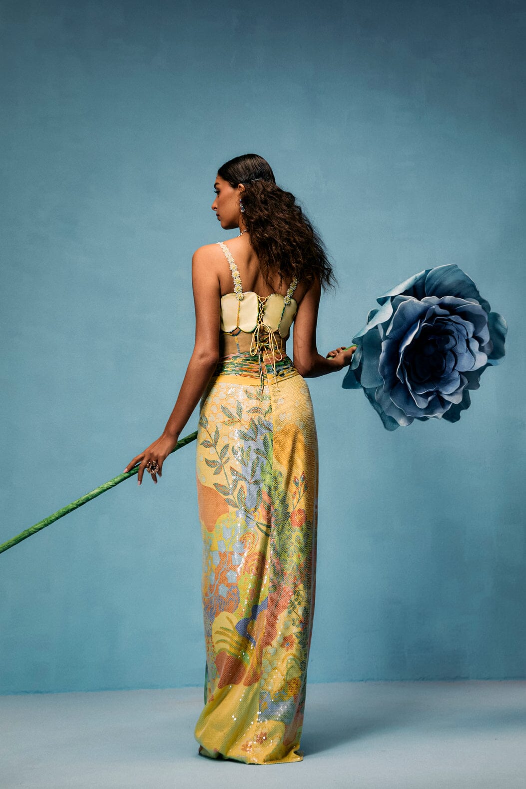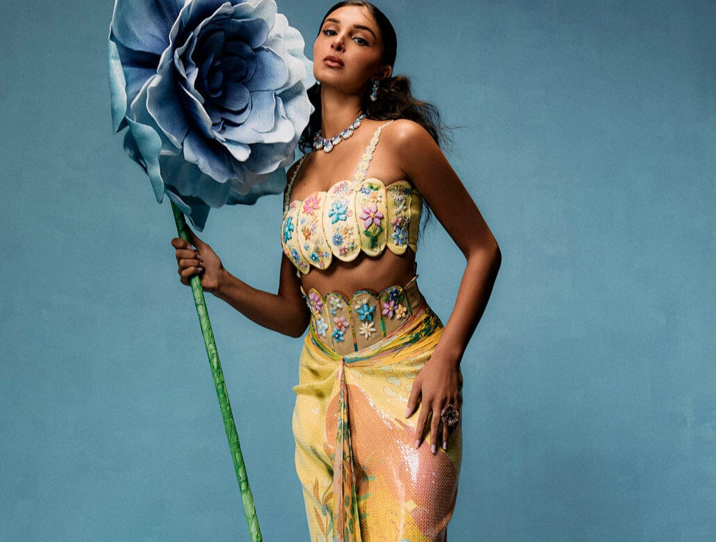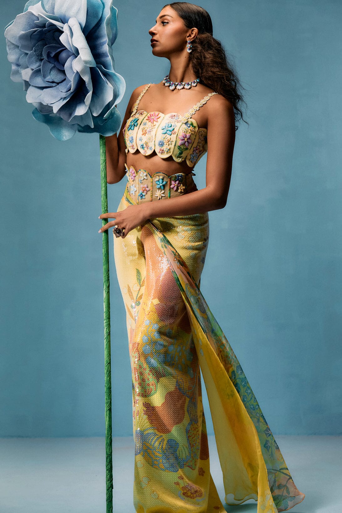Painterly prints and delicate florals converge in a celebration of nature’s beauty fantasising a dreamy landscape making the "Mimosa" set. The corset belt skirt, crafted from sequined embroidery, multicoloured bugle beads, crystals, and threads, evokes daydreams of serene vistas. The edges of the skirt are inspired by the elegant arches of Mughal gardens, adding an architectural touch to the flowing silhouette. Paired with the panel crafted capsule blouse in butter yellow, adorned with quirky cuts and intricate 3D embroidery. Metallic threads, silk threads, sequins, glass beads, and seed beads combine to replicate lifelike floral motifs. The blouse's edges mirror the Mughal garden arches, seamlessly tying the design to its historical inspiration. Hues of yellows, peaches, and greens blend harmoniously, making "Mimosa" a vibrant and playful tribute to nature’s artistry.