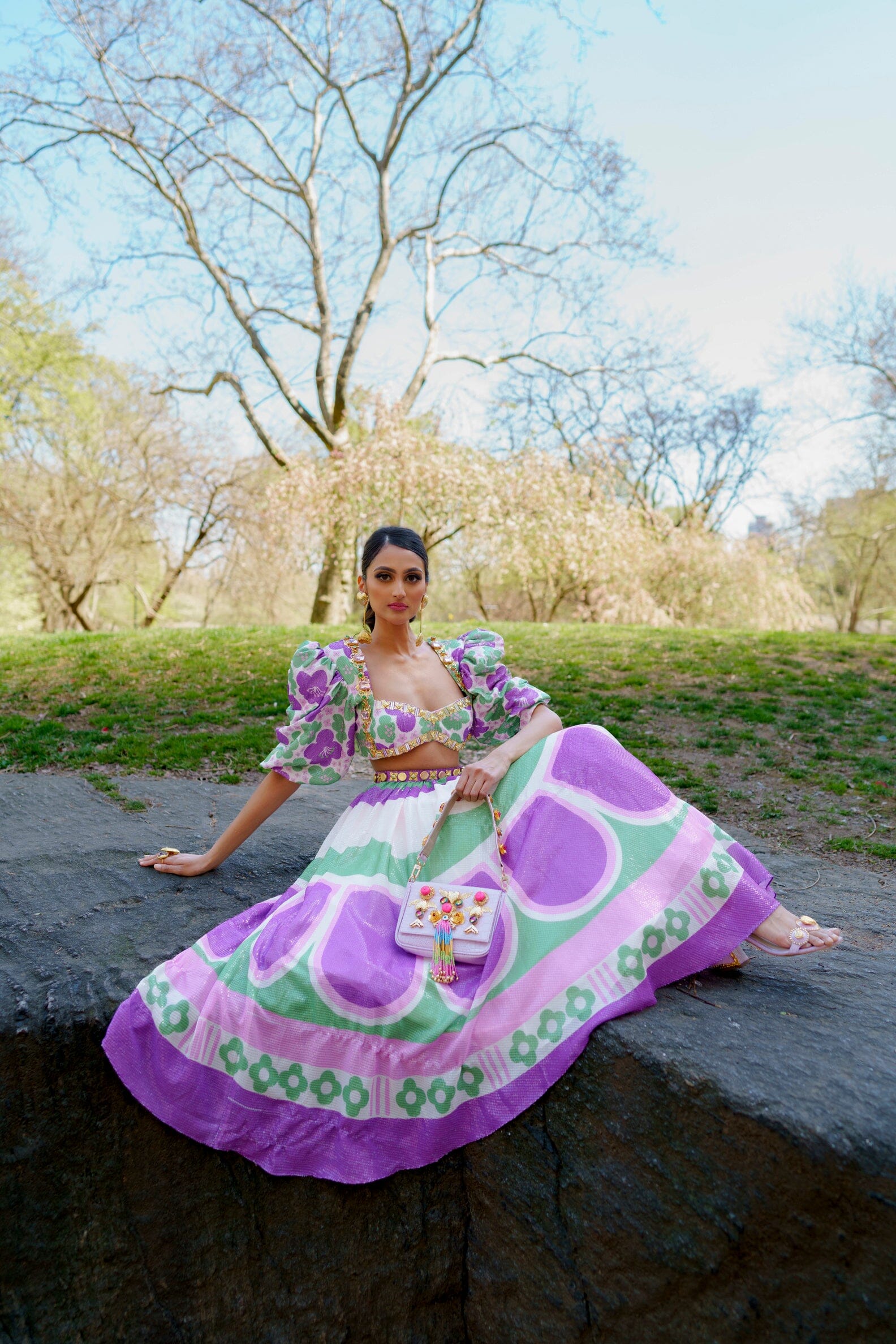 Say hello to Mimosa! A brand new silhouette for the season. Mimosa embodies fluidity in a mustard and pink gown with a hand draped organza bottom. The dress features intricate embroidery with lilac crystals, gold glass cones and square embellishments filled with lilac glass cut beads that catch the light to create an iridescent effect.