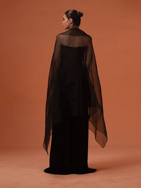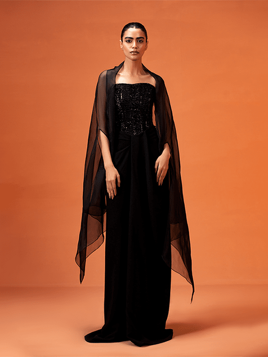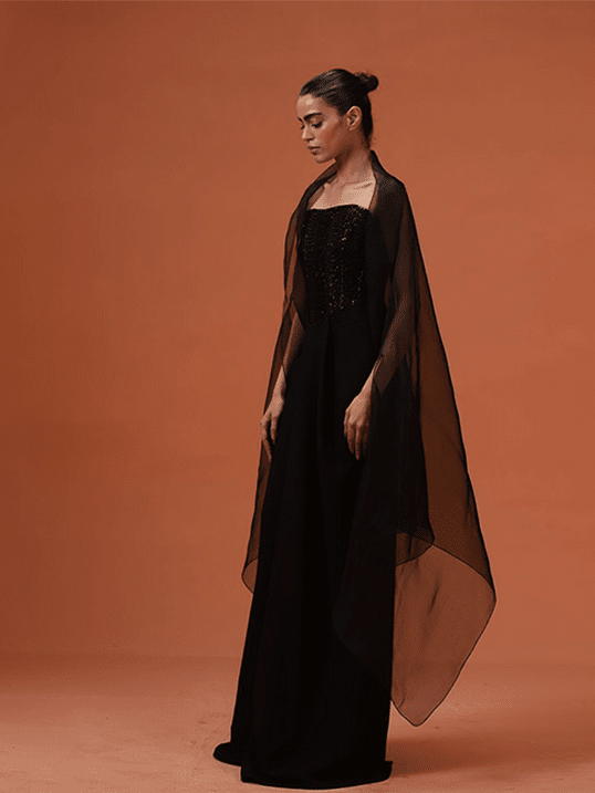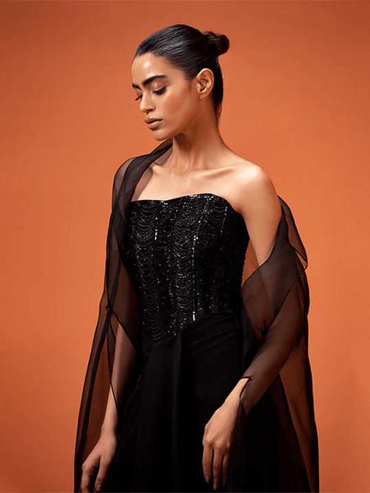 Titled "Noir Crystals," this article showcases an exquisitely designed, hand-embellished corset. Adorned with crystal beads, glass beads, and sequins, this corset features adjustable strings at the back for a customizable fit. Paired with draped flared pants and a black organza cape, it exudes elegance and sophistication.