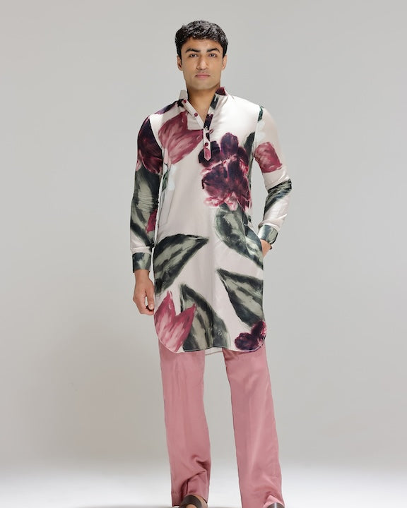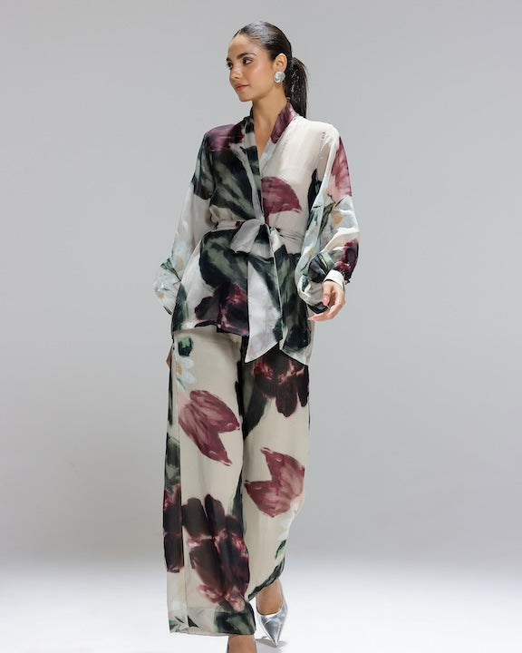 This orange floral printed choli is embroidered with floral embellishments, paired with a matching high-waist panel pants and a delicately embrodiered georgette dupatta.