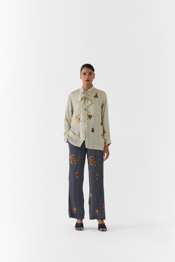 The Pearl Polka Dot Knot Shirt & Onxy Polka Pants crafted from our stunning vegan silk fabrication, trans-seasonal, is a statement piece. This set, printed in our jewels polka print, has a straight fit. With a knot at the neck, the shirt has ruching on the cuff and a front opening. It is paired with our matching tijori trousers with an elasticated back. Wear it with heels for an elegant look.