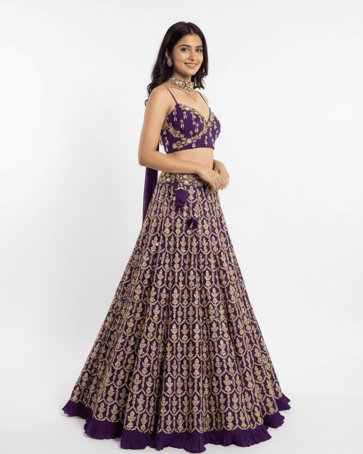 Elevate your style with this stunning pink floral draped skirt paired with a bold, waist-cutout choli adorned in gold embroidery. Complete with a blazer featuring intricate detailing, this ensemble blends modern flair with traditional charm, perfect for the fashion-forward youth.