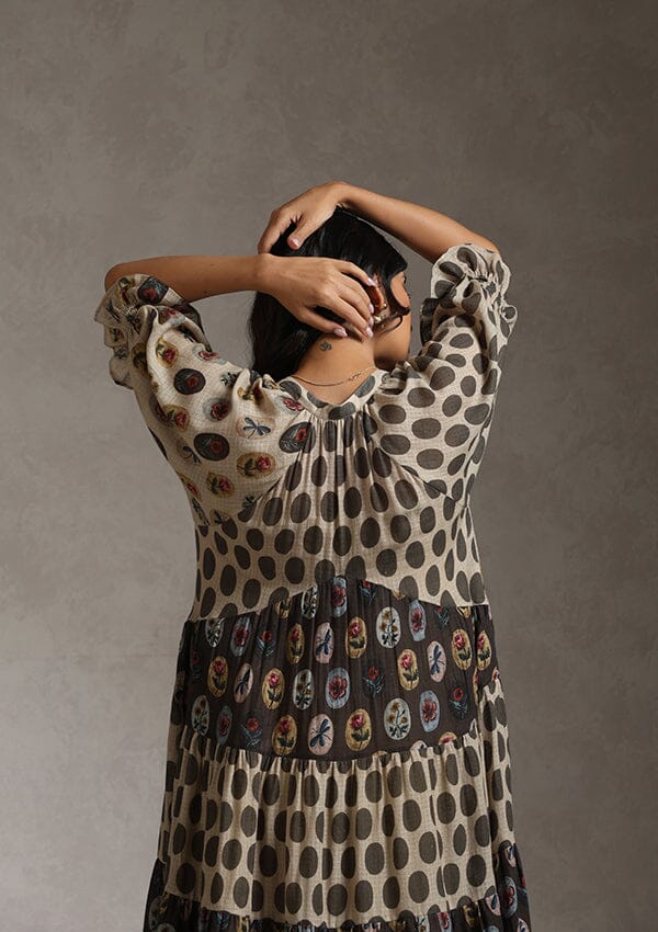 A printed midi dress that comes in a tiered style. An easy slip on dress crafted out of soft cotton Kota in a relaxed silhouette. The dress comes with a separate slip.