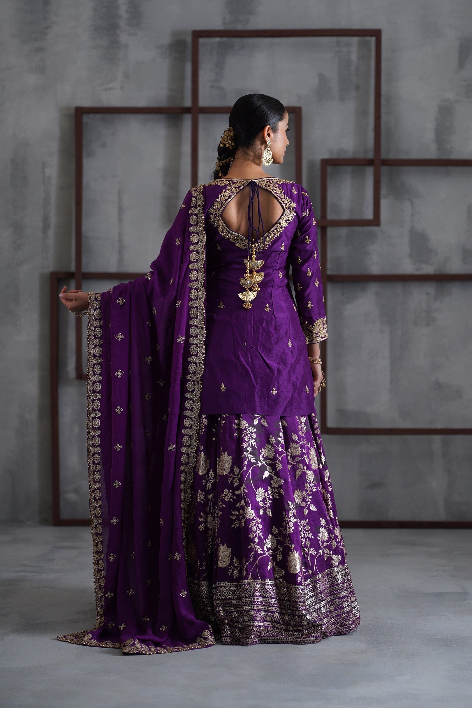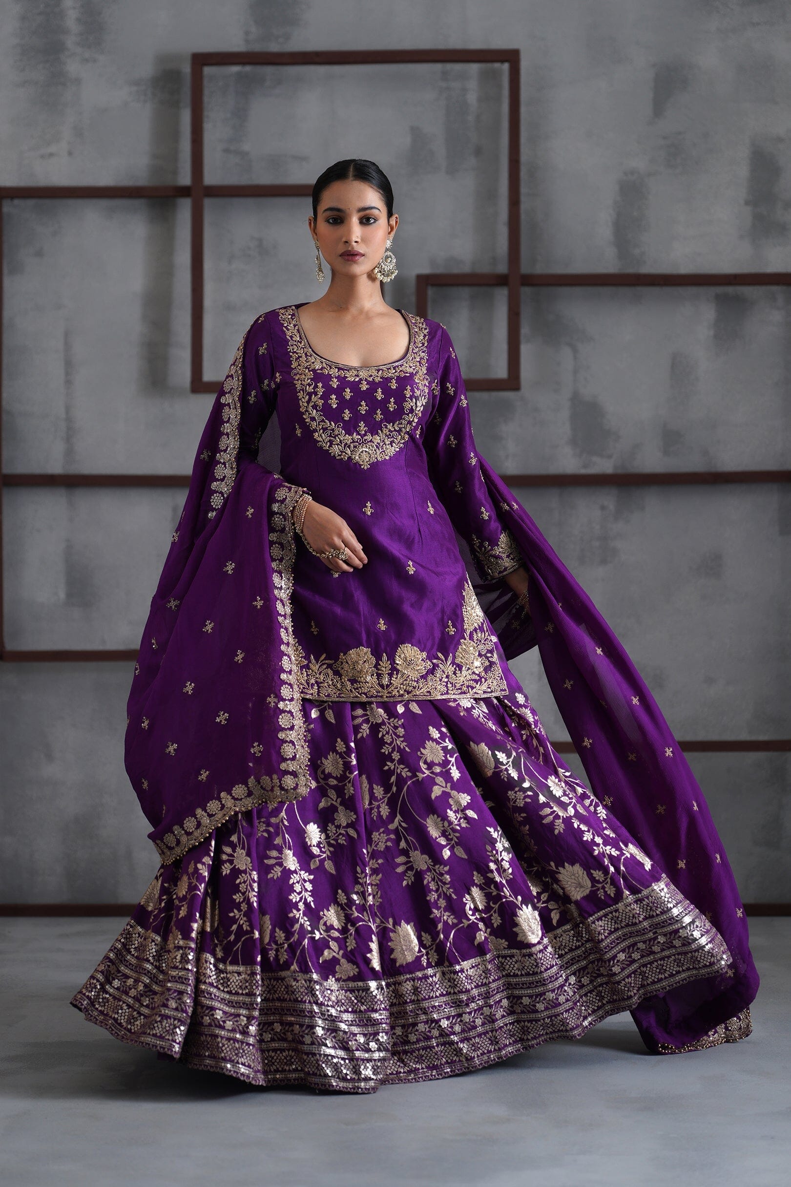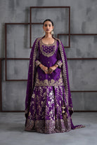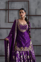 Deepika Chadha's stunning Purple and gold silk fabric kurti, beautifully adorned with intricate pearls , stone and sequins embroidery. The flowy gold and purple banarsi lehenga with borders adds a touch of tradition and sophistication to your look, while the embroidered chinnon dupatta is perfect for wedding and festive season.