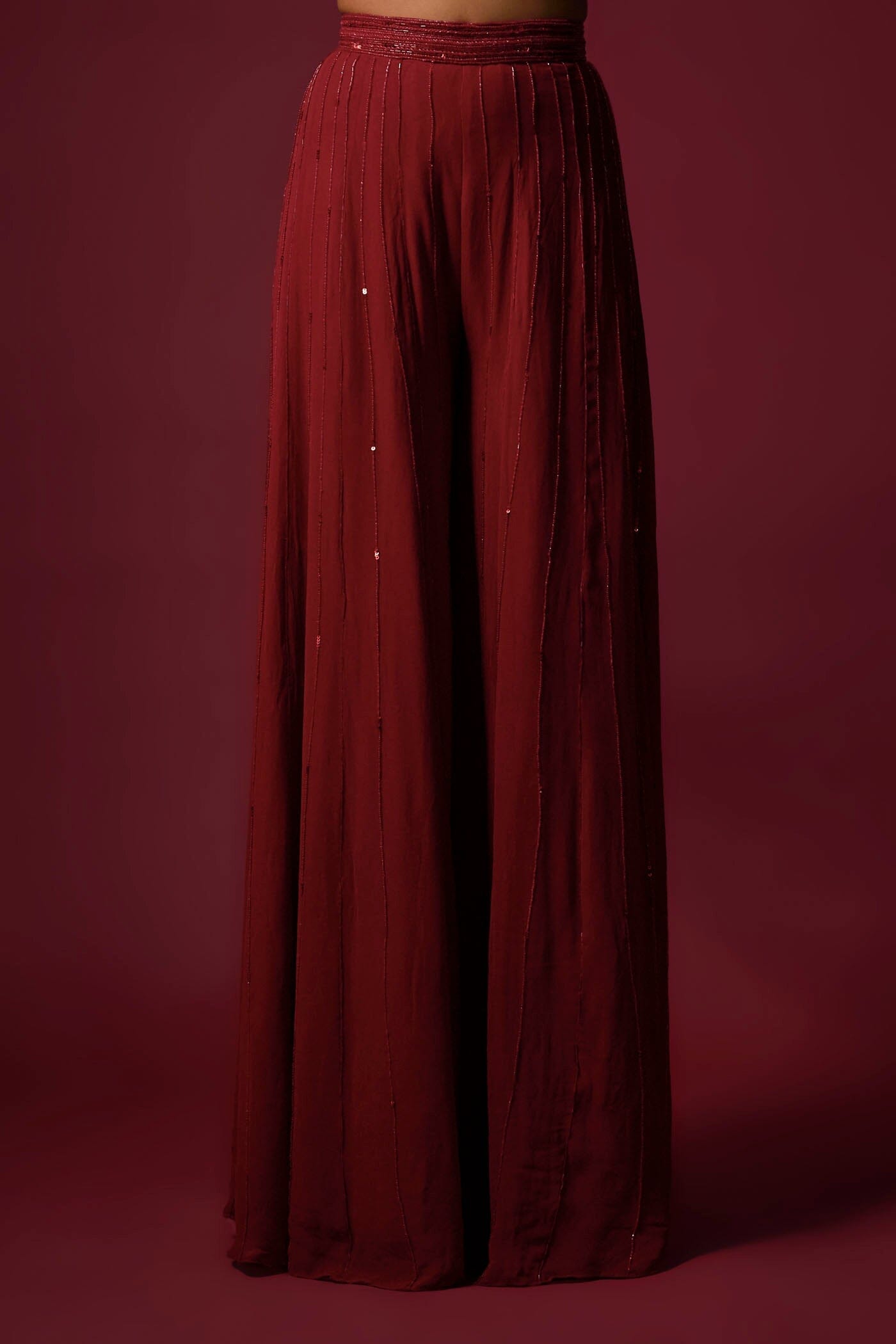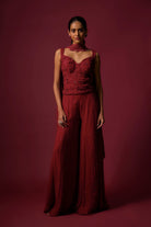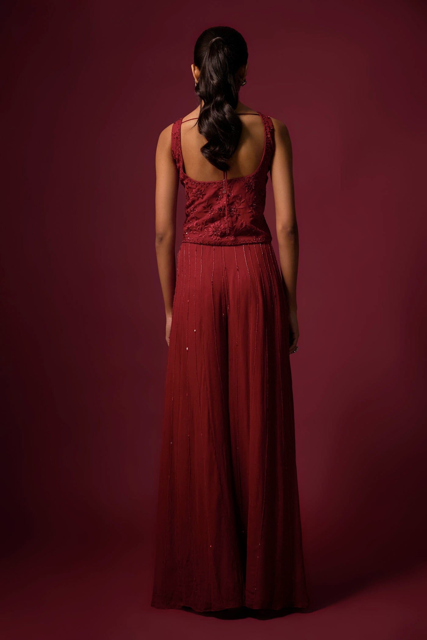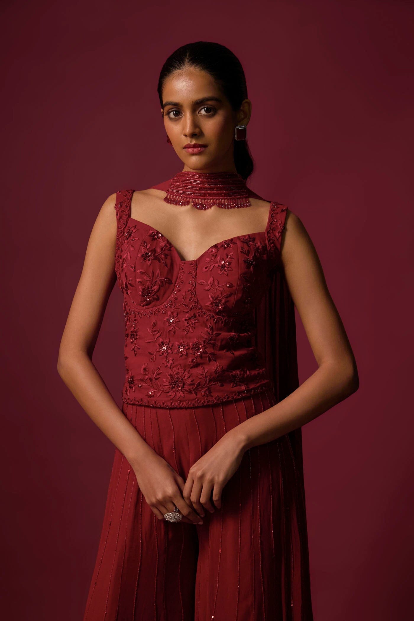 A refined deep red corset-style long top paired with fluid georgette kali pants, intricately detailed with subtle linear embroidery in tubes, sequins, and beads. The look is elevated with an elegant tone-on-tone embroidered neckline and a sheer choker dupatta, finished with delicate embellishments and graceful hangings.