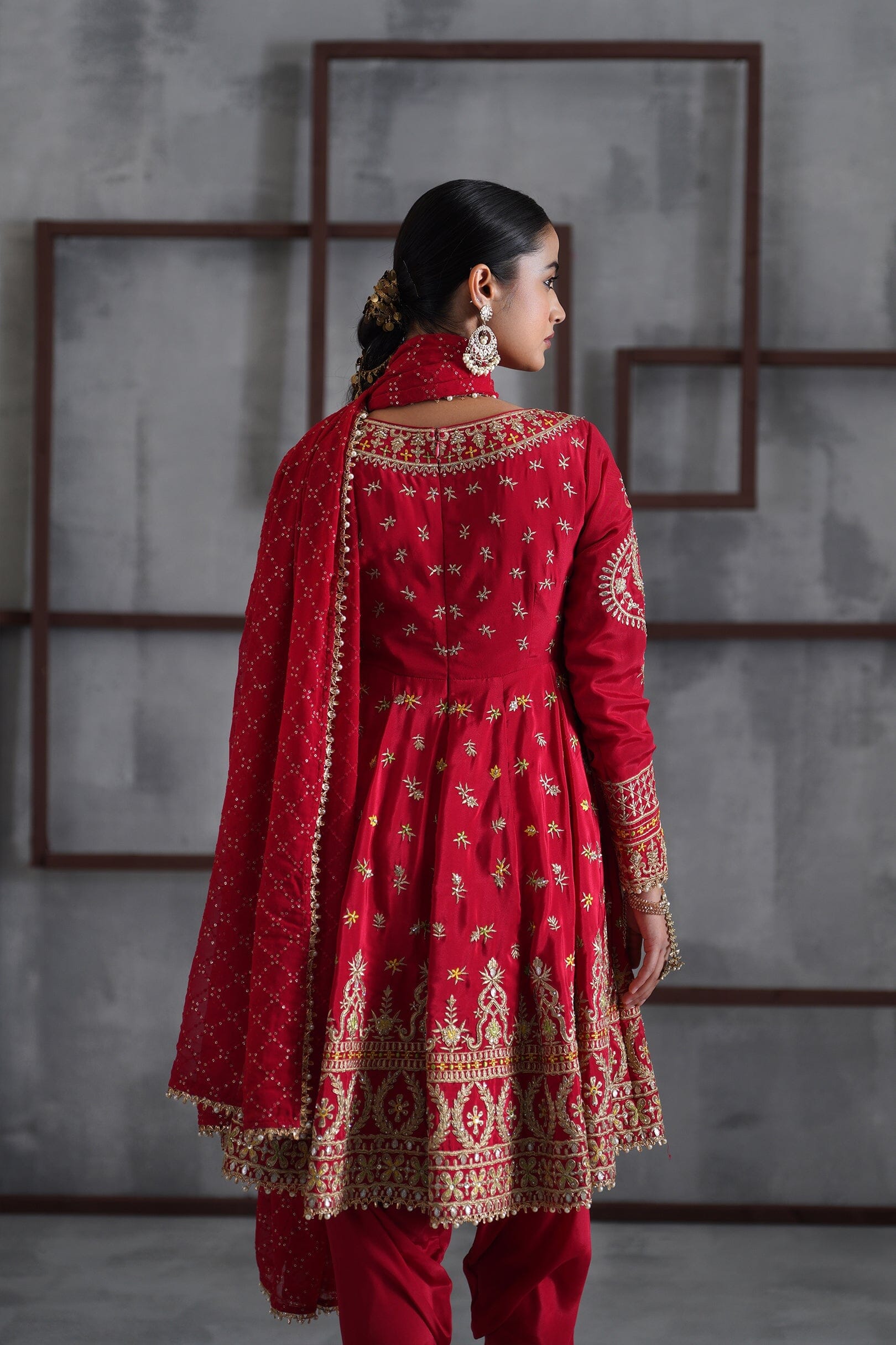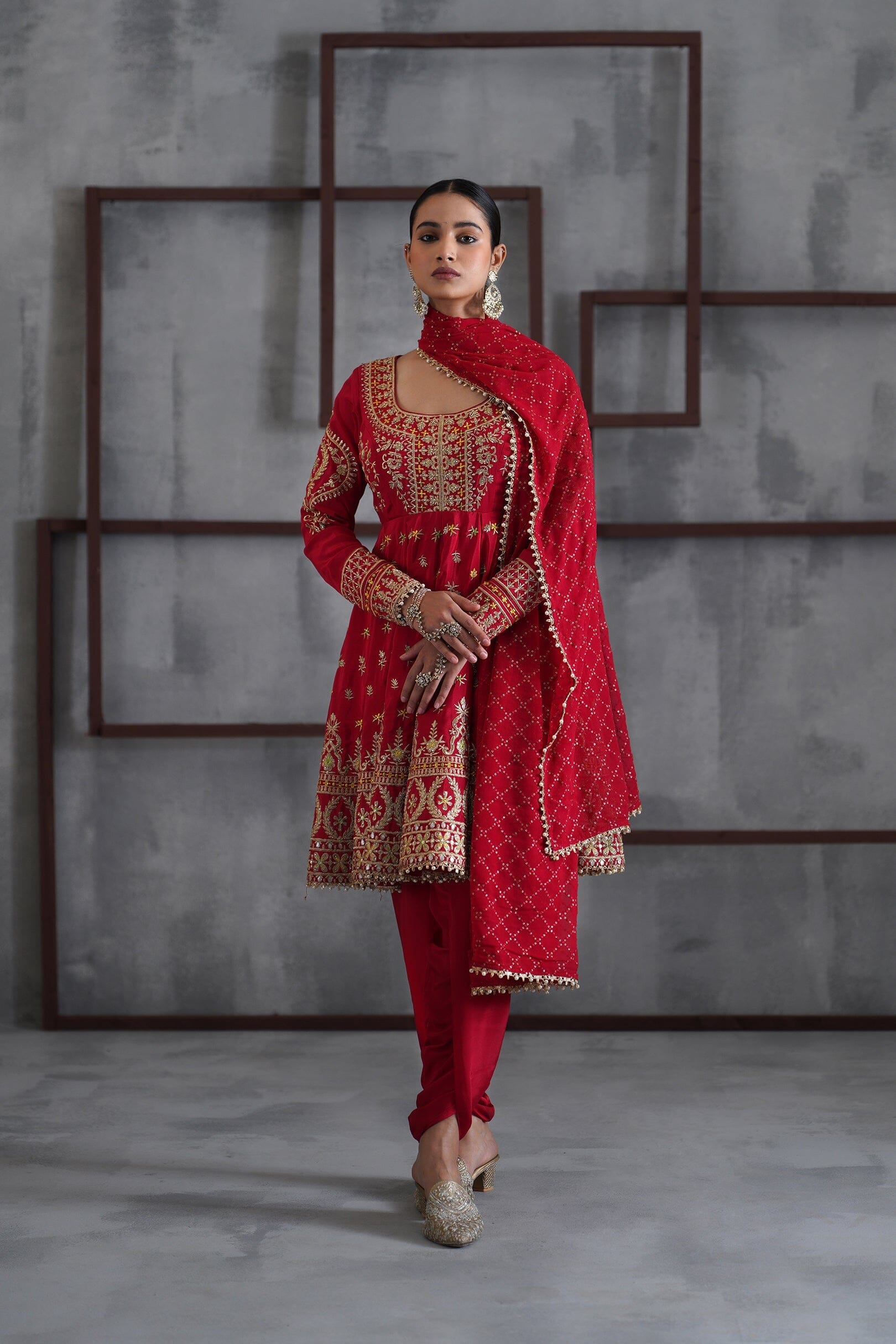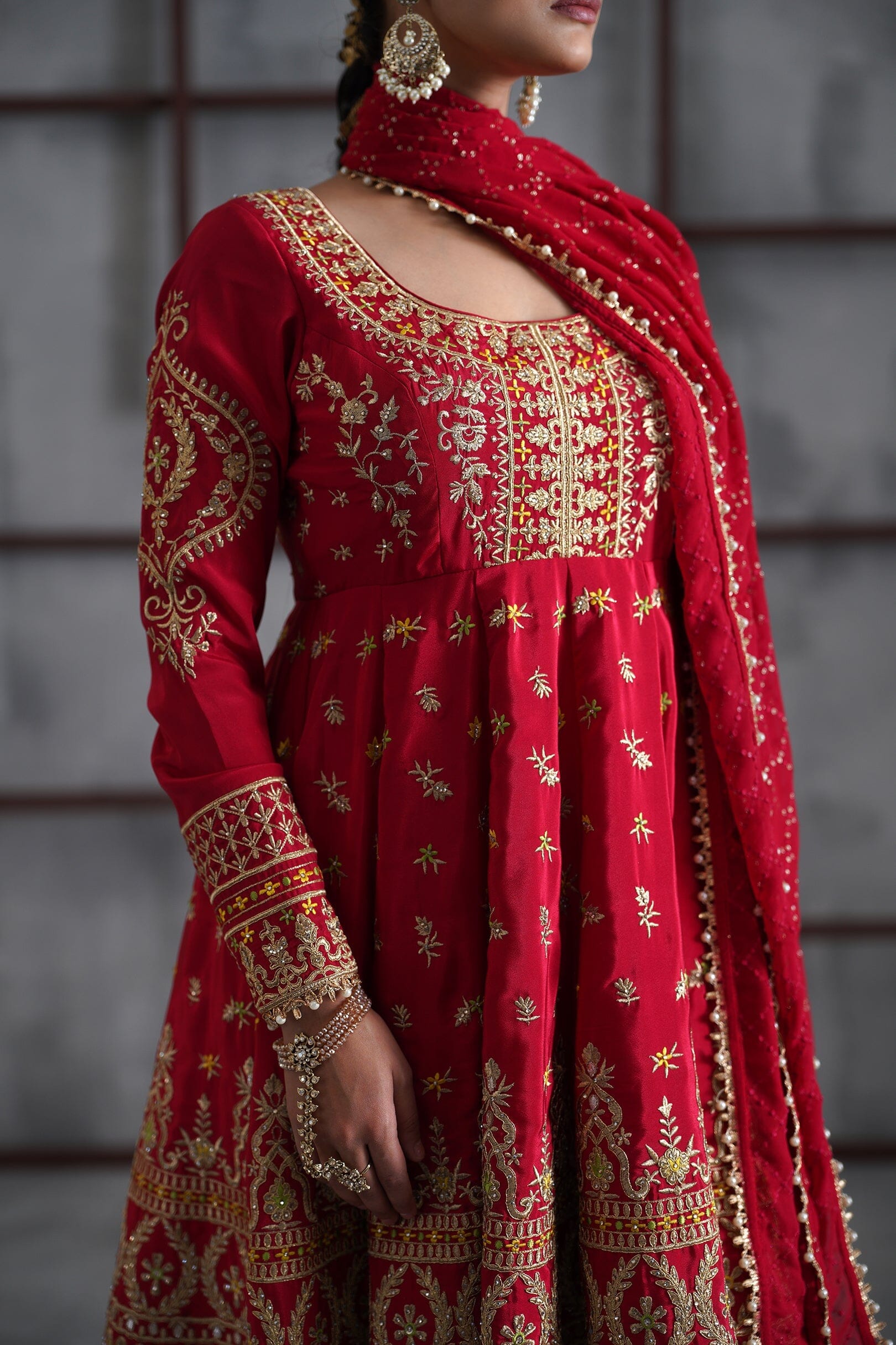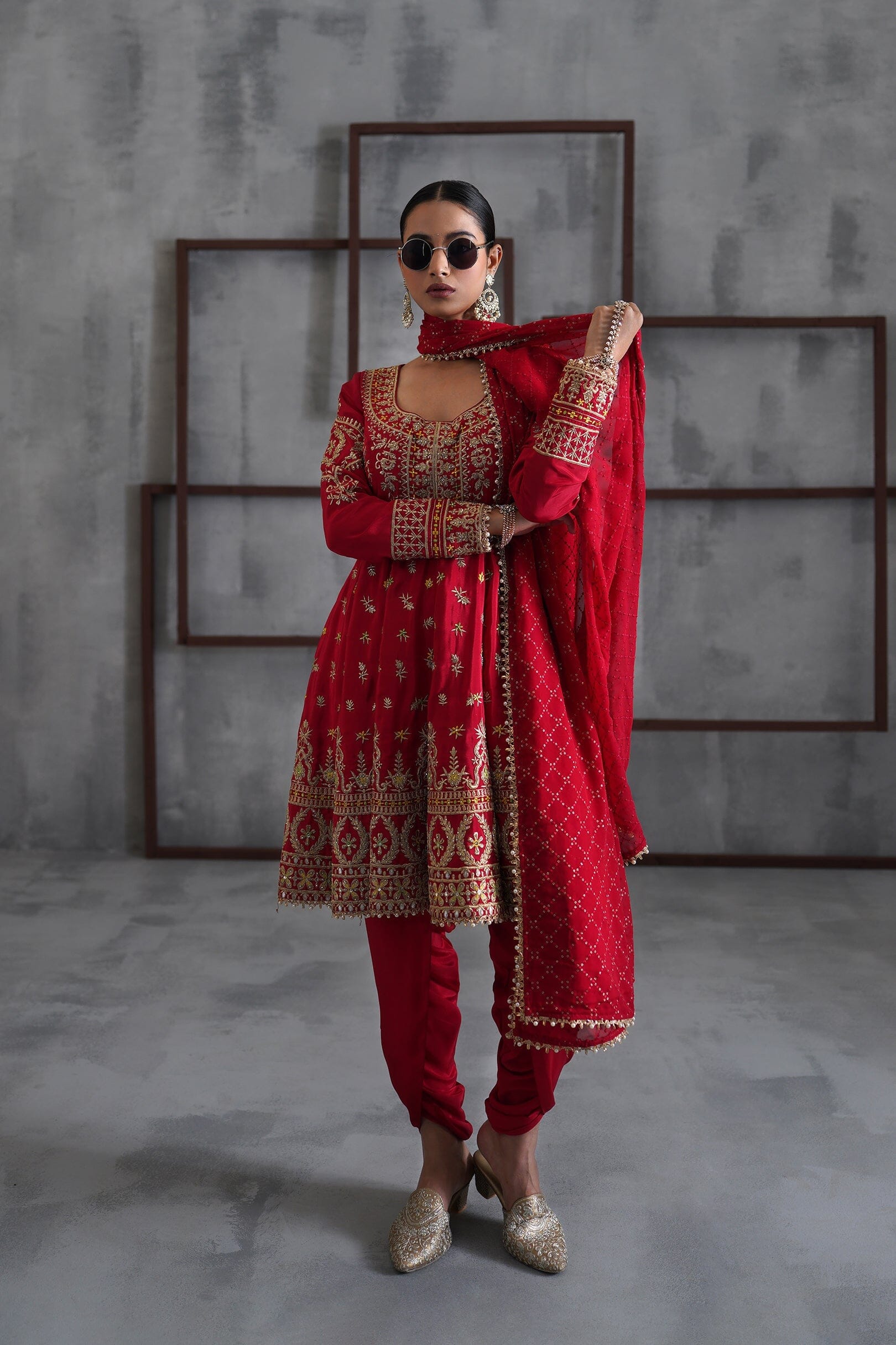 Deepika Chadha's stunning red and gold crepe fabric anarkali, beautifully adorned with intricate sequins, cutdna, beads, crystals and zari embroidery while the bottom are red crepe fabric tulip pants. It is paired with the red embroidered georgette dupatta embellished with pearl and gotta adds a beautiful look to it and keeps you light and comfortable all day long and is perfect for wedding and festive season.