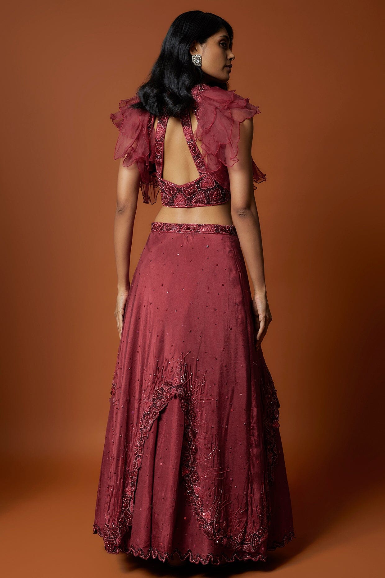 Introducing a stunning tomato red geometrically embroidered choli with ruffle sleeves, paired flawlessly with a two-layered asymmetrical lehenga and an ethereal organza dupatta. Its sexy back detail adds allure, making it perfect for wedding cocktails and sangeets, exuding glamour at every turn.