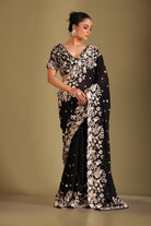 This set includes a Black Georgette Saree with Intricate Embroidery. The saree features exquisite ivory thread and sequin work spread gracefully across the body, creating a delicate floral booti pattern. It is further enhanced with intricately designed floral borders, adding a touch of elegance and craftsmanship throughout the drape.