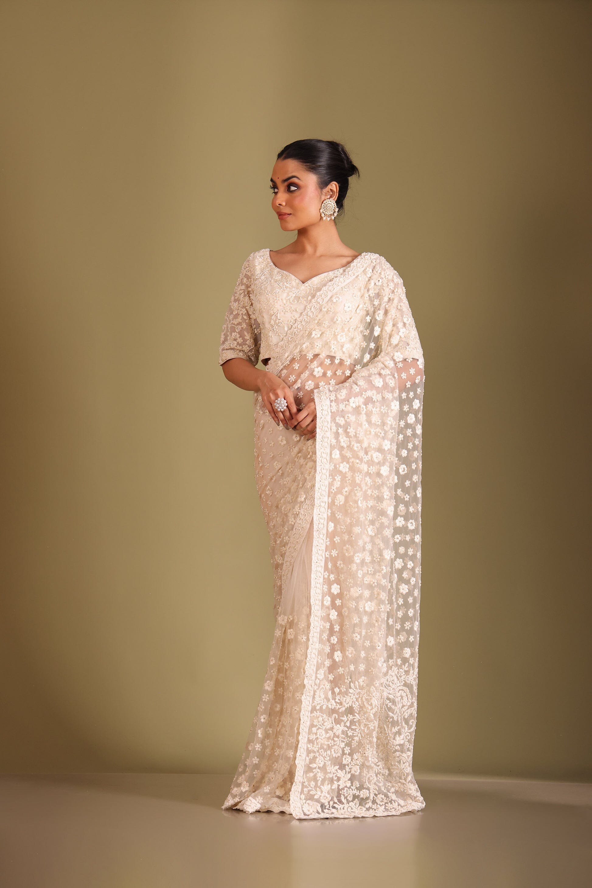 This elegant set includes a saree and a matching blouse. Embroidery: All-over hand-done thread embroidery, embellished with pearl and zarkan work Design: Floral embroidery on the pallu, complemented by intricate floral motifs scattered across the saree