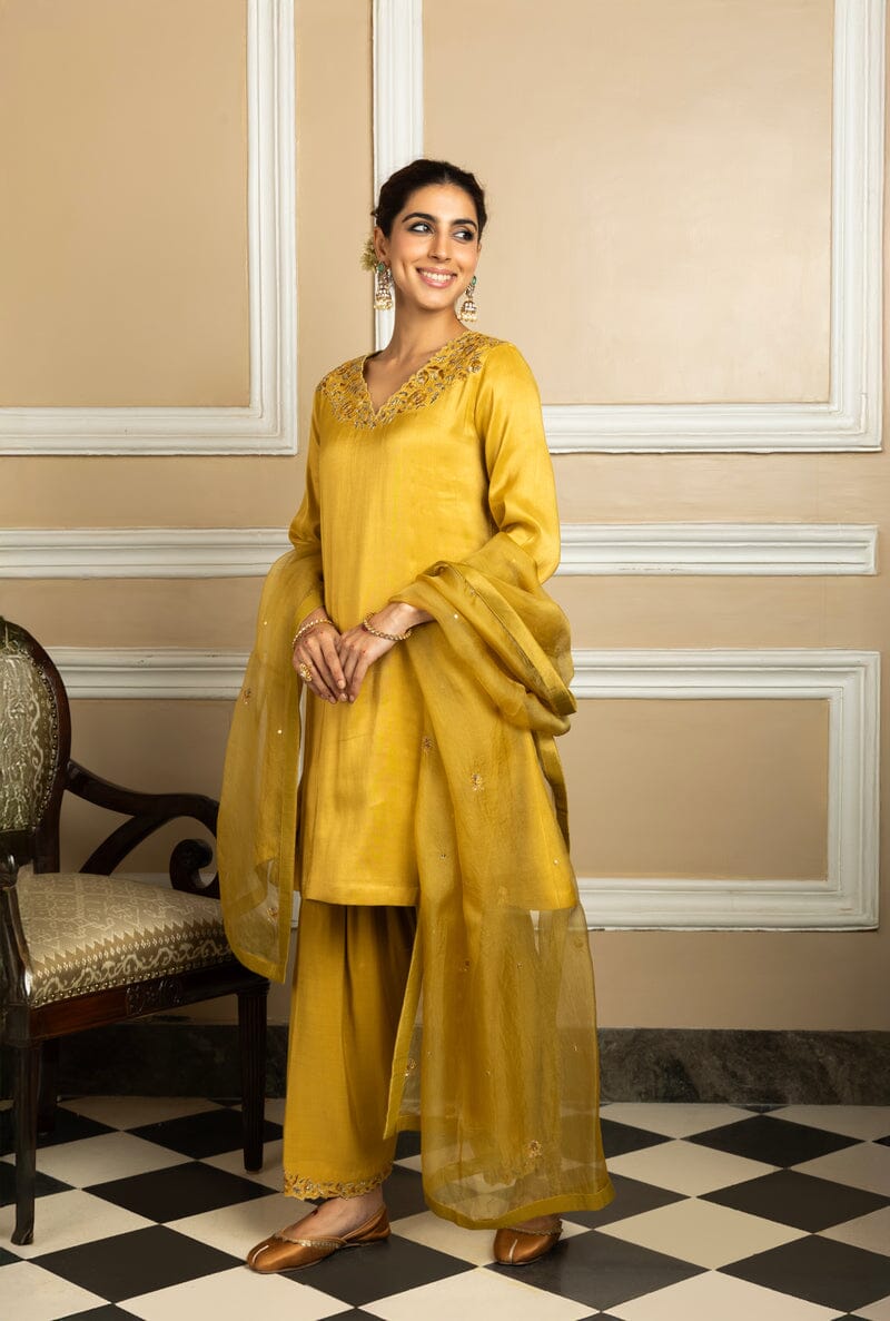 Designed for both style and comfort. Saanvi Mustard A-line short kurta set is paired with a traditional salwar. The kurta is adorned with intricate embroidery featuring dabka, zari, cutdana, resham, sequins, and gota, bringing out exquisite detailing and fine craftsmanship.