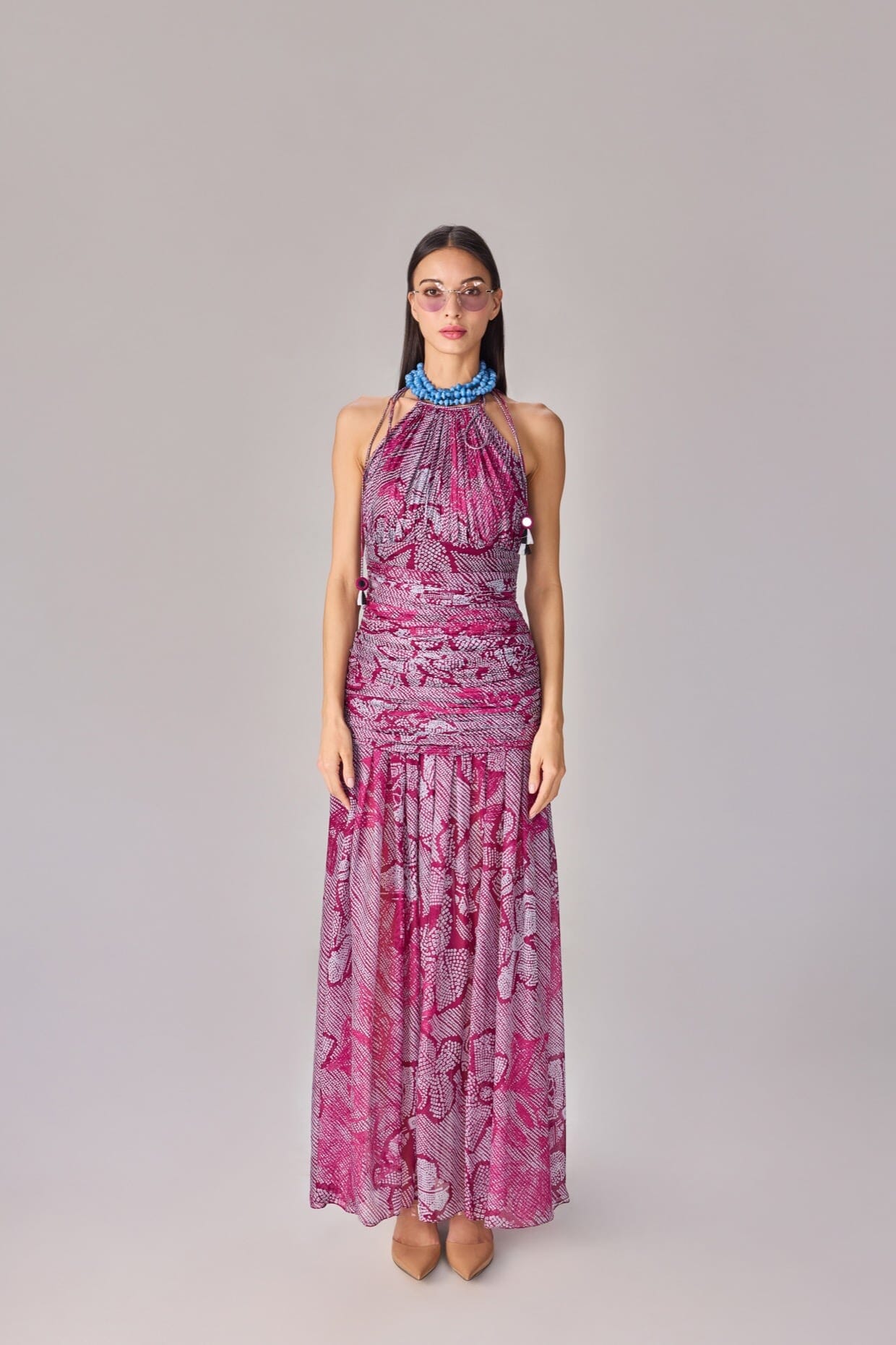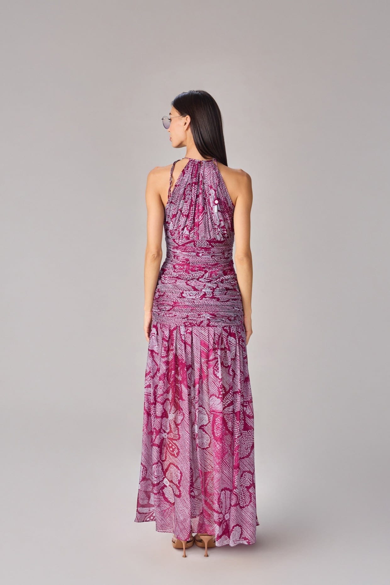Bandhani And Floral Print, Halter Neck Maxi Dess With Hand Micro Pleat Bodice And Waist, Customisable Side Slit And Hand Embroidered Mirrored Tassle Tie Ups