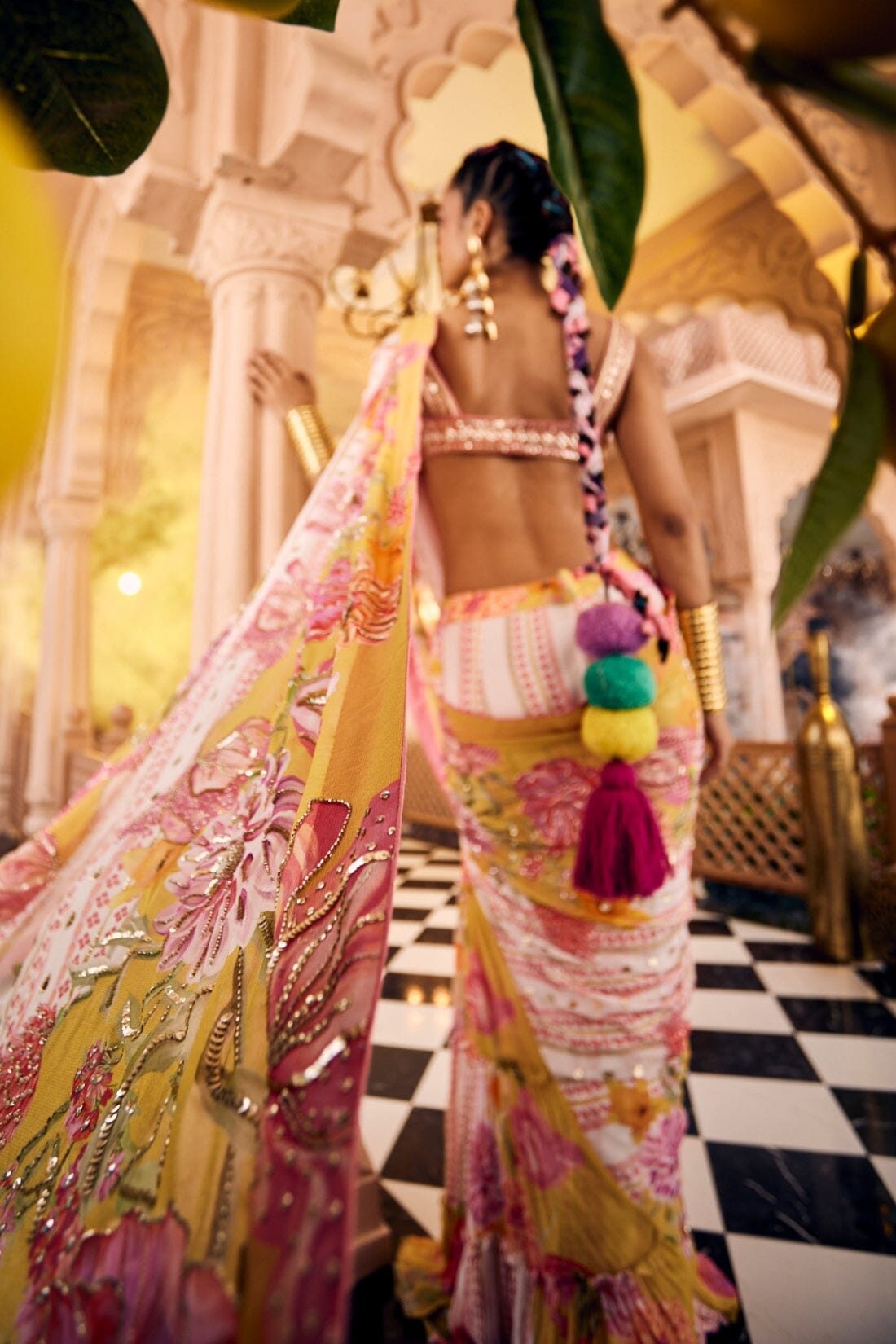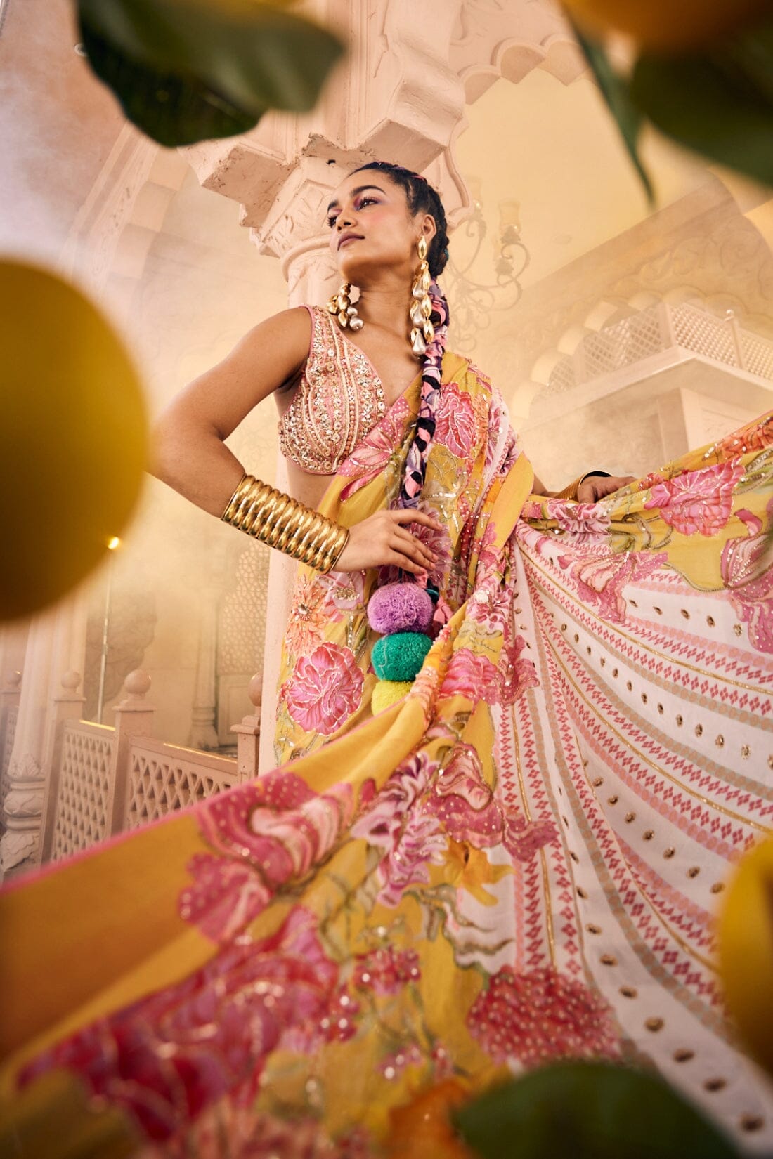 An elegant off-white, multi-printed, embroidered pre-draped saree set, paired with a heavily embroidered blouse