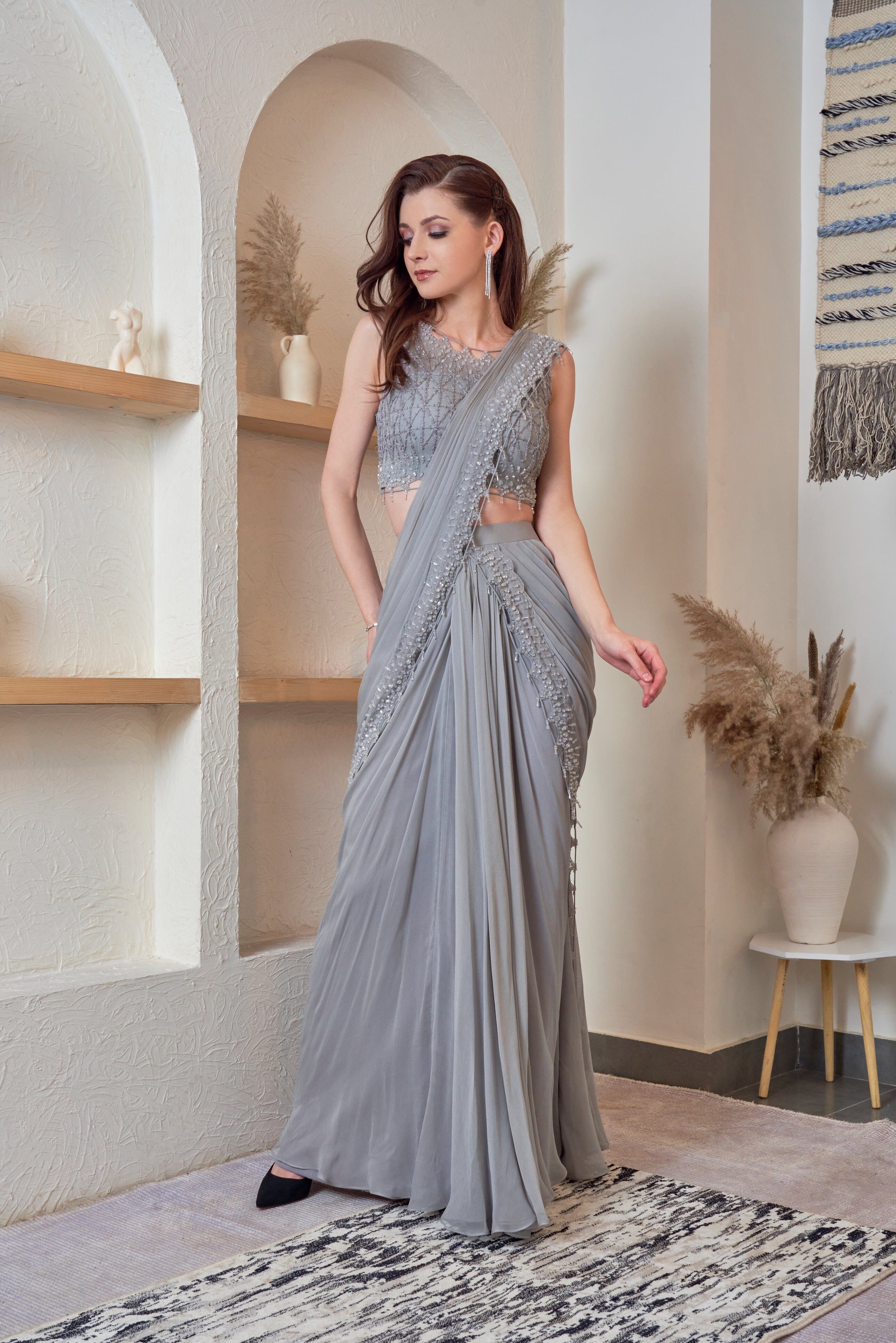Deshazte de lo básico con este encantador sari gris con un borde Dori festoneado adornado con cuentas, perlas y piedras brillantes. La espalda está bordada con patrones lineales. La blusa está acolchada para un ajuste perfecto.