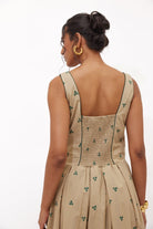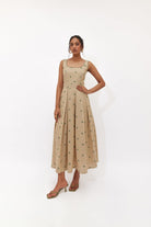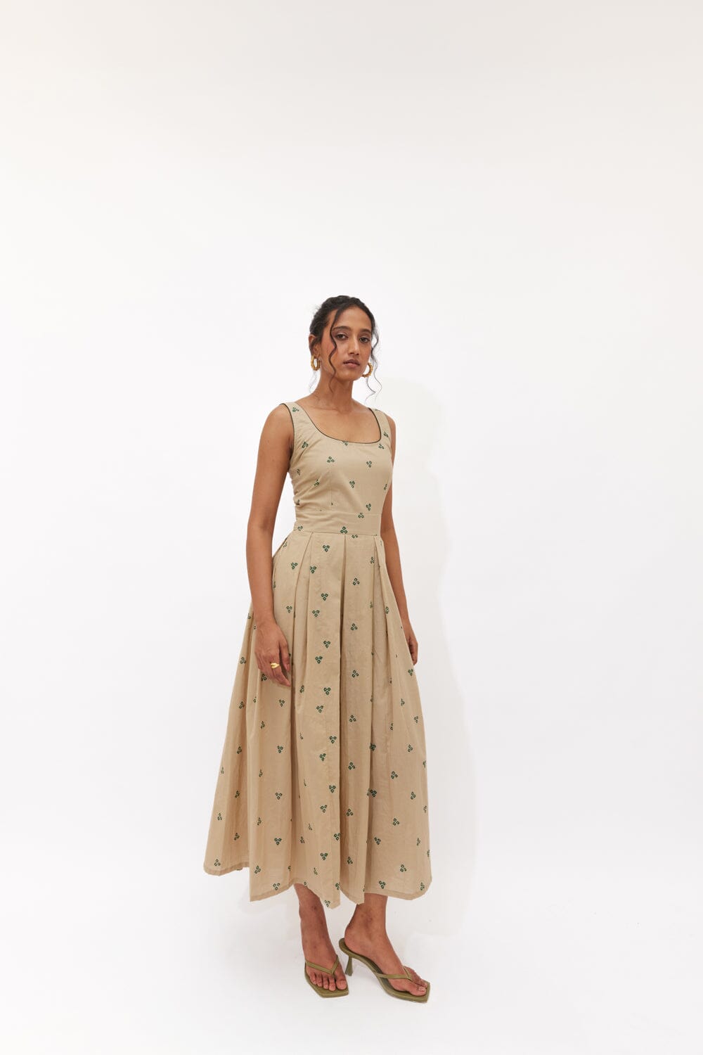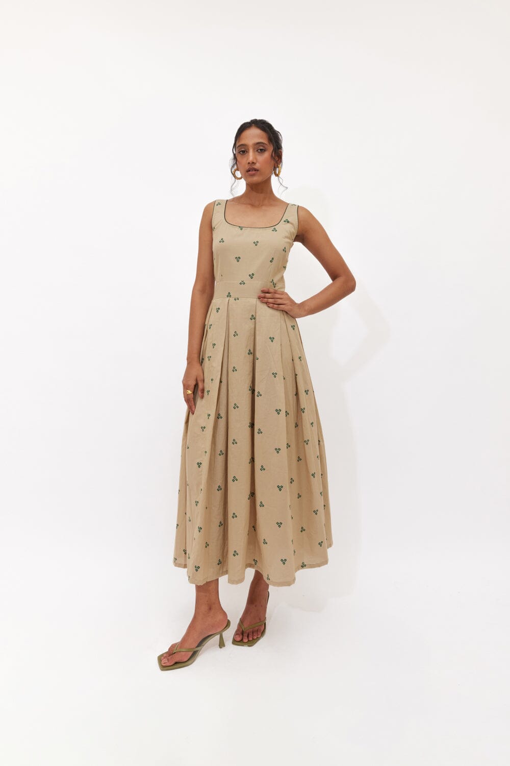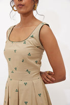 The dress has a pleated skirt and features a contrast piping on the neckline and armhole