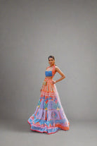 Step into Serenity, where the trees are adorned with shimmering sequins and the leaves glisten like diamonds. Our lilac sequin printed lehenga embodies the magic of an enchanted forest, with its golden embroidery work, celestial palm trees and crystals. Paired with a blue cowl halter neck top and a lilac net dupatta attached at the back flows like a mystical river.