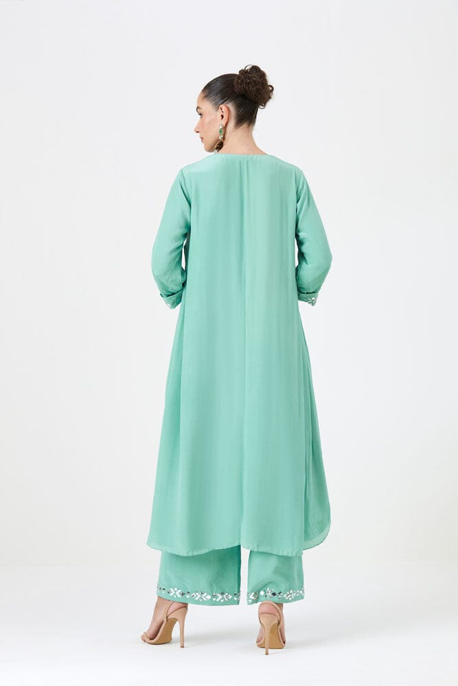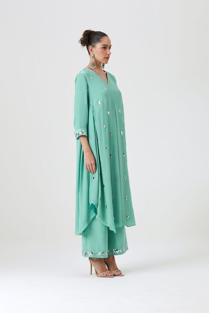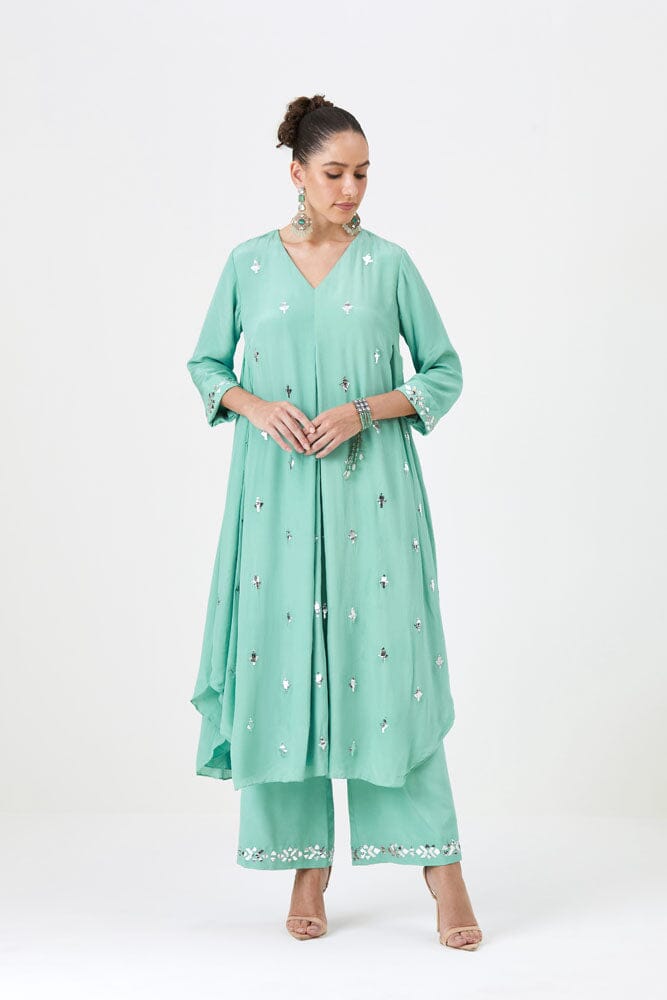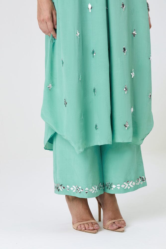 The Shabnam set features a tunic in a beautiful refreshing mint color crafted with natural crepe silk, adorned with Mukaish work. The Tunic is paired with matching pants to strike just the right balance for your pre-festive outings.