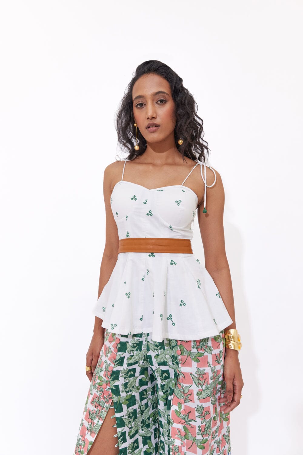 The peplum top comes with bust cups, elasticated back, side seam zipper and tie up shoulder straps for that added comfort.