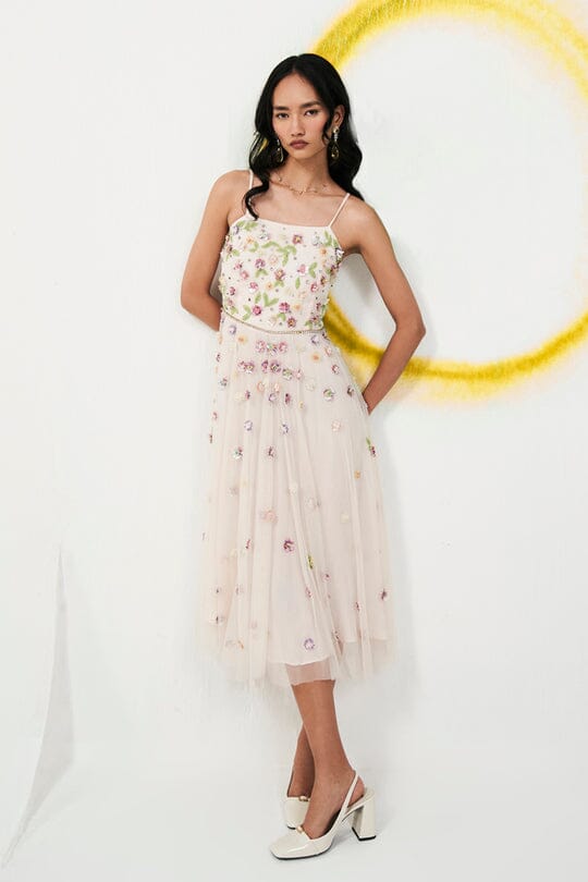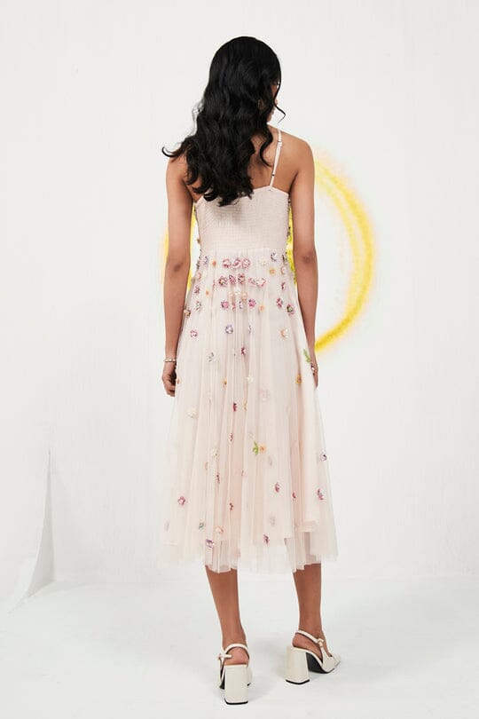 Floral embroidered sequenced 3d tulle dress in nude pink.