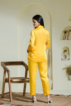 Shine bright like a sun in this sunshine yellow co-ord set.Handcrafted with delicate floral motifs on shirt,this beauty is paired with well fitted same coloured pants.The pants are also embellished with embroidered floral motif in the front.