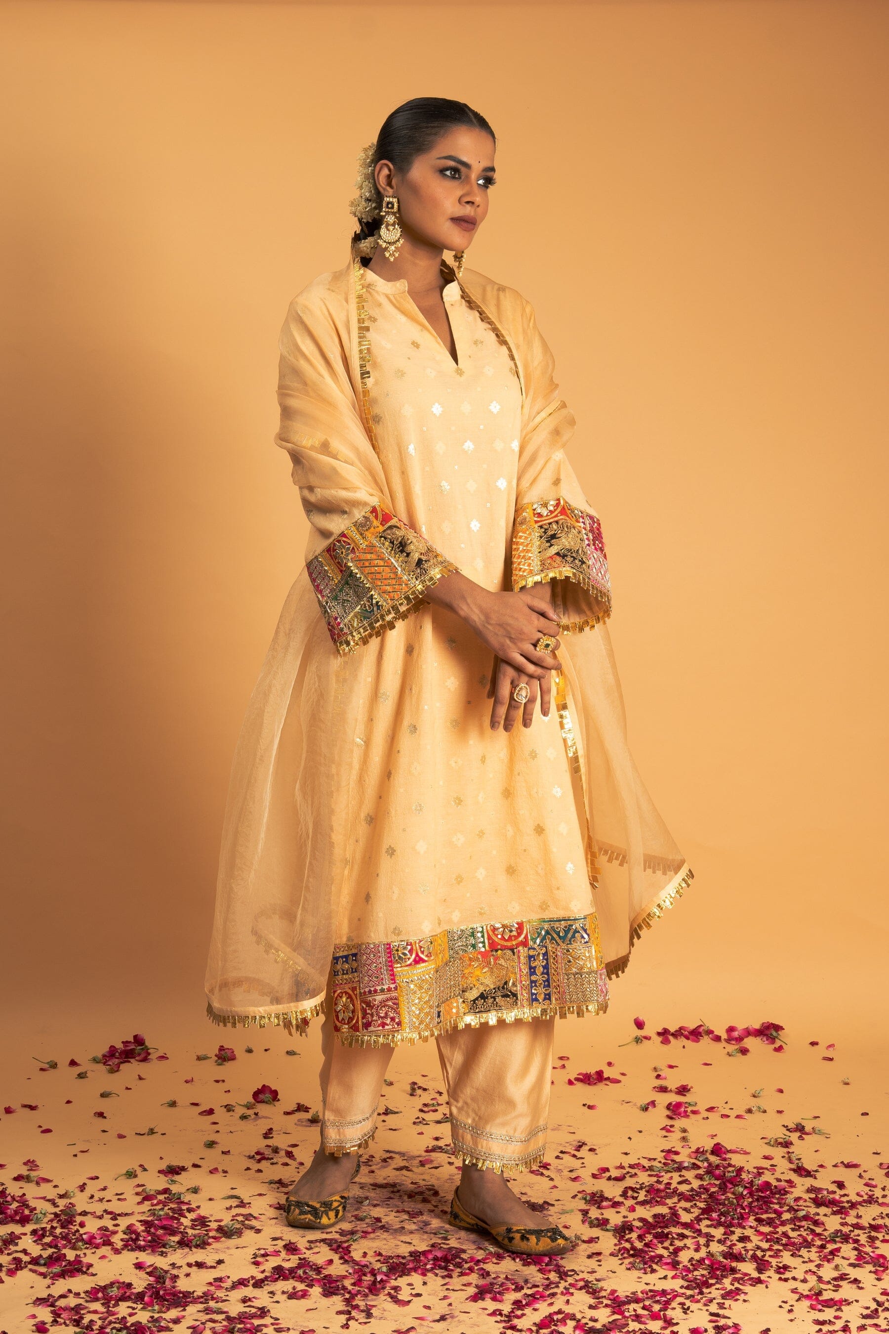 The Light Peach Chanderi Kurta Set features Gota applique work on the hem and sleeves of the kurta. The outfit is paired with an organza dupatta and Chanderi pants with Gota borders.