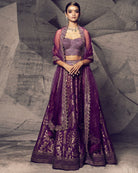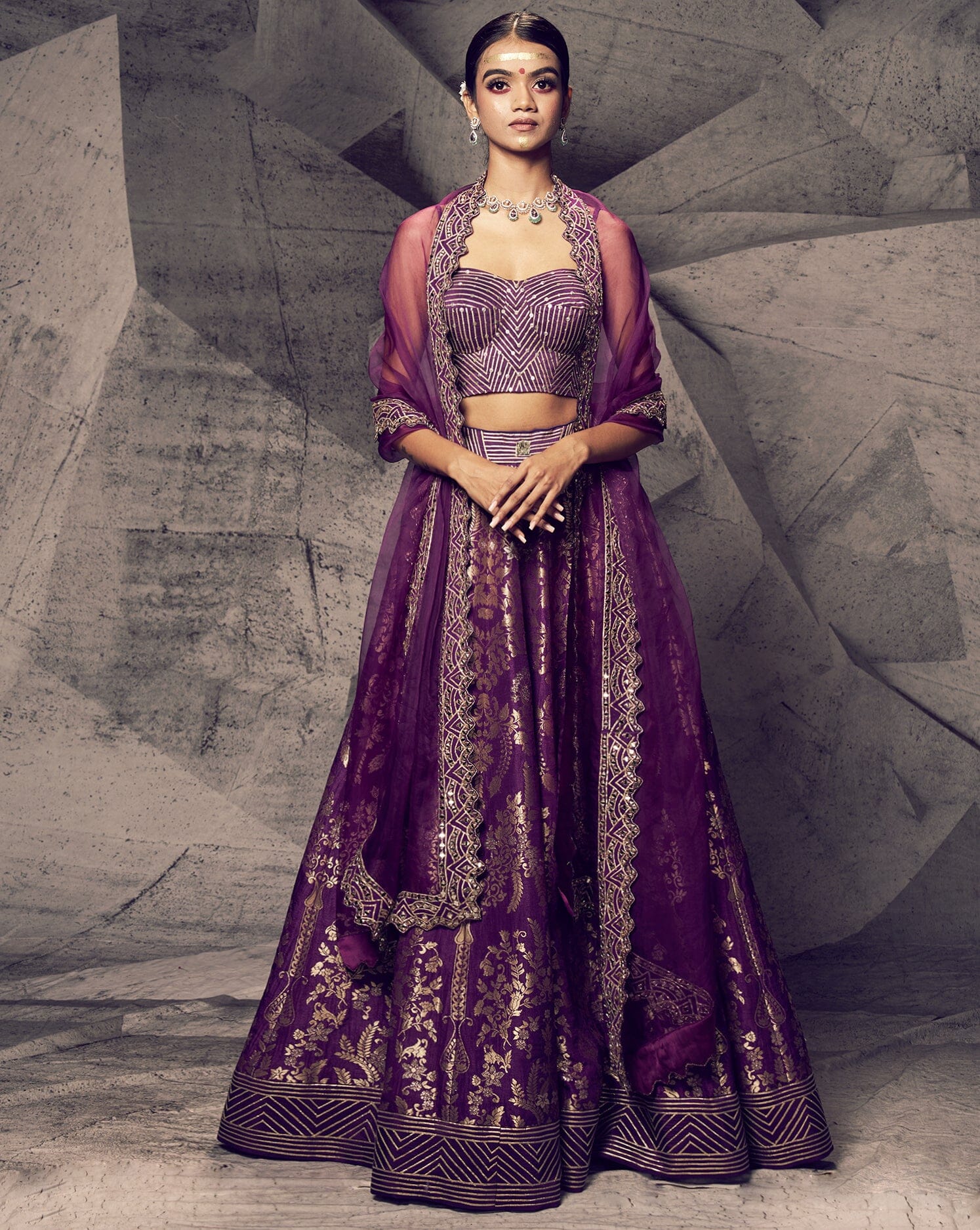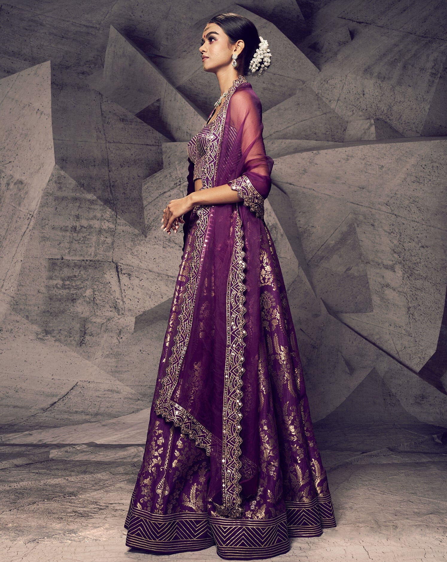 Envuelta entre los profundos tonos de púrpura y el brillante bordado tejido de brocado se encuentra esta hermosa lehenga de nuestra colección NYFW SS24. La lehenga está adornada con un bordado de hilo de gota en el borde y un cinturón y un bordado tejido de brocado en el centro. Se combina con una blusa de seda bordada con gotas. El conjunto está adornado con una dupatta de organza con un borde de espejo festoneado adornado para completar el look.