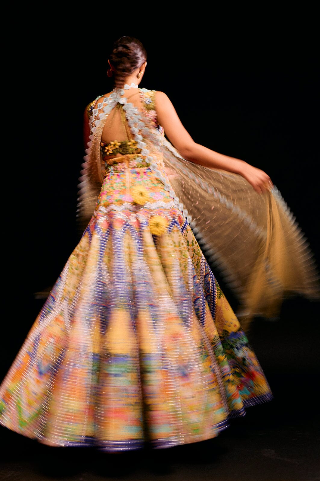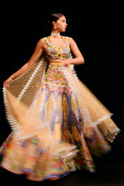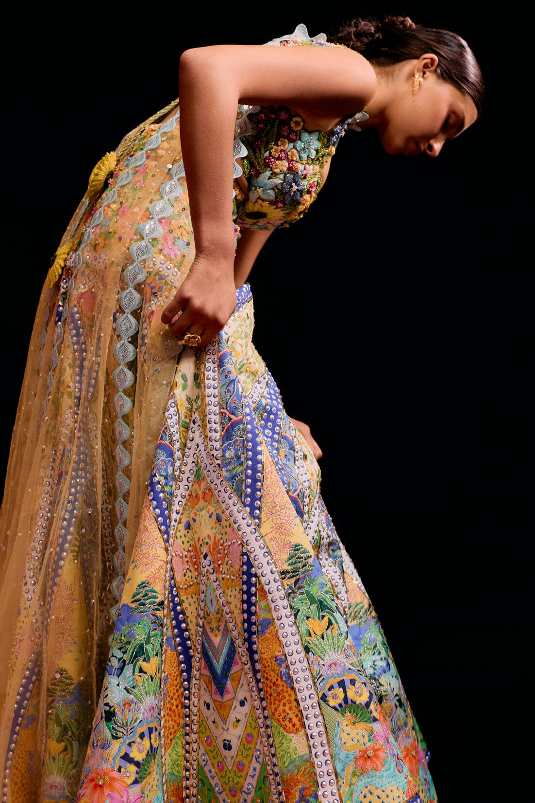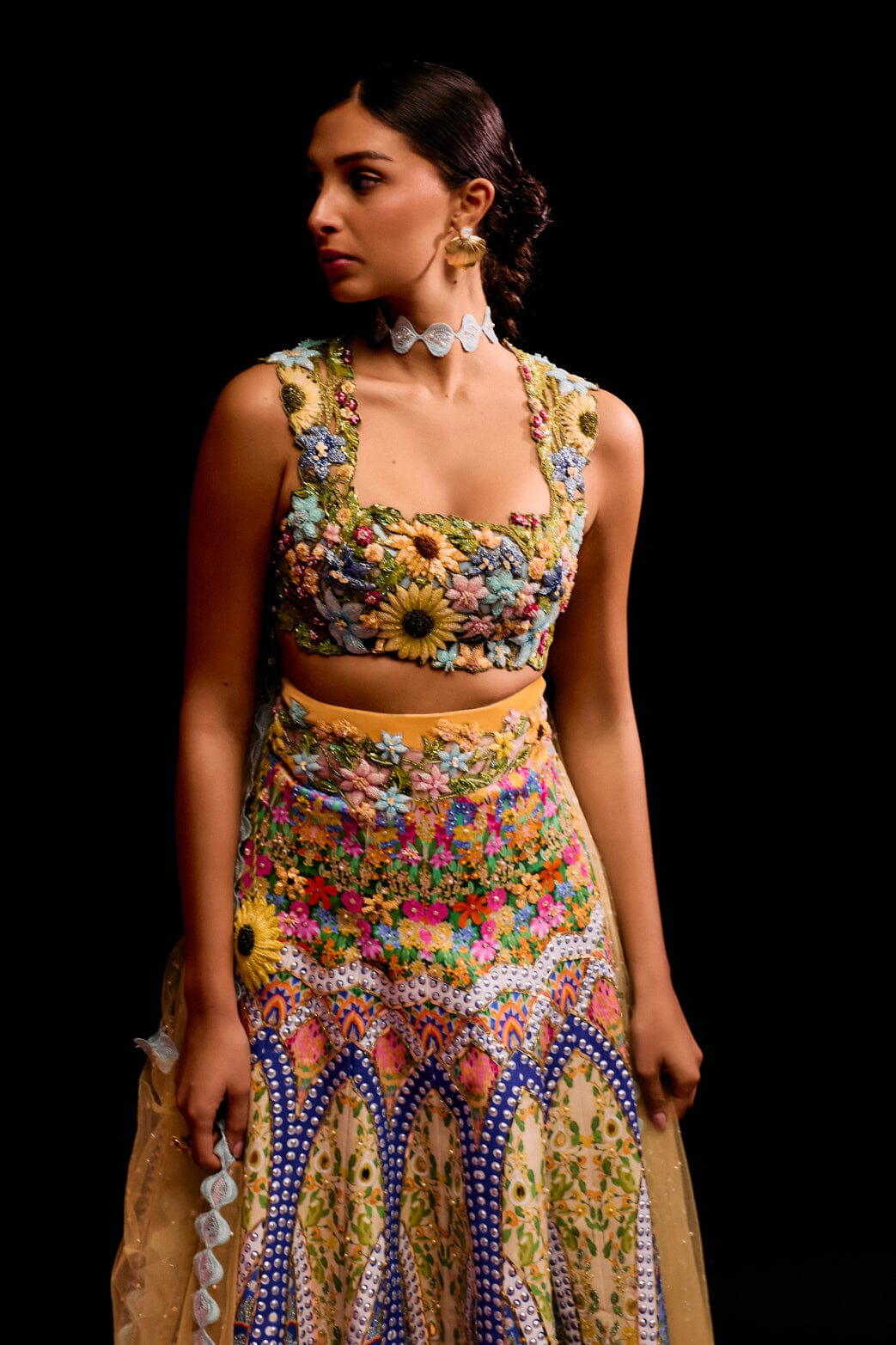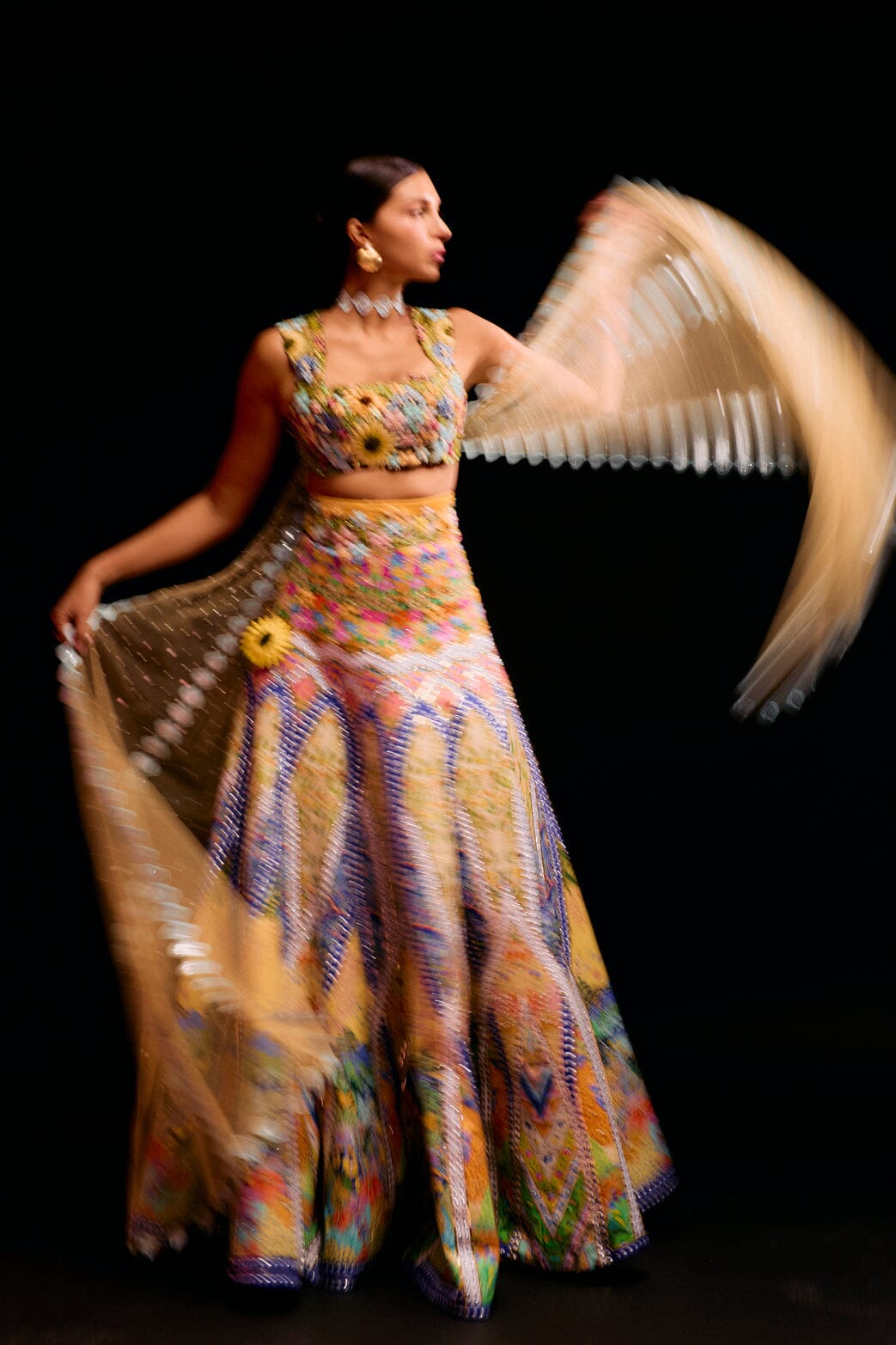 Inspired by the vibrant sunflowers in the iconic artist's paintings of "Van Gogh", the painterly printed lehenga features an exquisite sunshine pattern that bursts with golden yellows and earthy greens, creating a lively and dynamic effect that mirrors the painter’s bold strokes. Paired with a square-neck bustier that perfectly flatters every figure, this set exudes a modern, artistic charm. The ombre dupatta with floral details adds a soft, ethereal touch, gently draped to complete the look with grace and movement. Van Gogh is a perfect blend of artistry and elegance, capturing the true essence of the sunflower fields with every hand-painted silhouette.